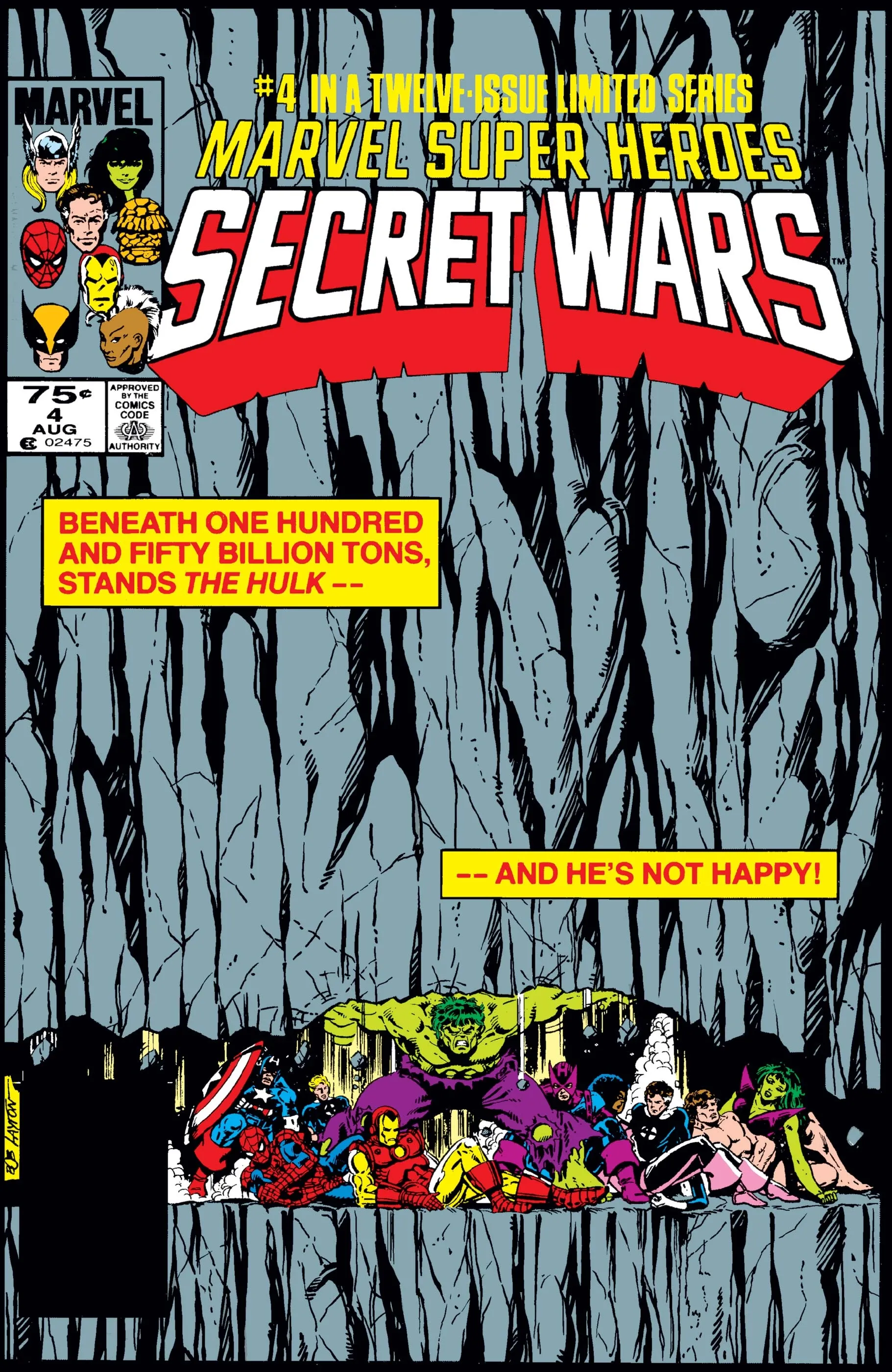 The Hulk is known as the strongest hero in the Marvel Universe, and a powerful cover illustration by Bob Layton for Secret Wars #4 perfectly captures his immense strength. The image shows the Hulk single-handedly holding up an unbelievable 150 billion tons of rock to save his fellow heroes from being crushed. The sheer weight he’s bearing is emphasized by the massive mountain that dominates the entire cover. Amidst a huge team-up event featuring almost every major Marvel character, this Secret Wars #4 cover makes sure the Hulk gets a moment to shine.