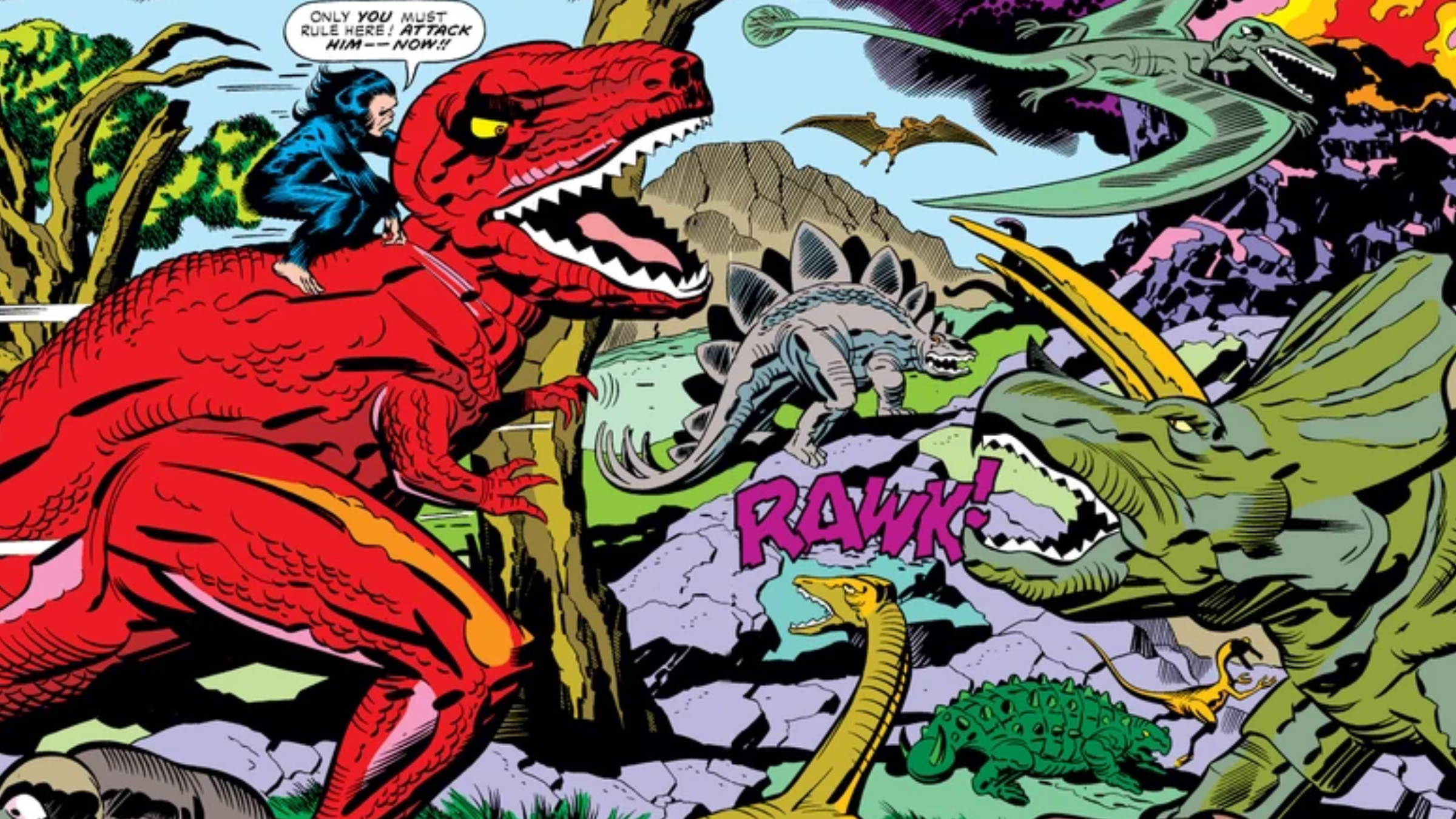 Earth-78411 is a prehistoric alternate universe that first appeared in Devil Dinosaur #1 (1978), created by the renowned Jack Kirby. This world centers on the friendship between Devil Dinosaur and Moon-Boy, presenting a unique and visually dynamic take on a primitive Marvel Universe. Though its stories generally stand alone, Earth-78411 showed Marvel’s ability to create captivating worlds independent of its main heroes like the Avengers or X-Men.