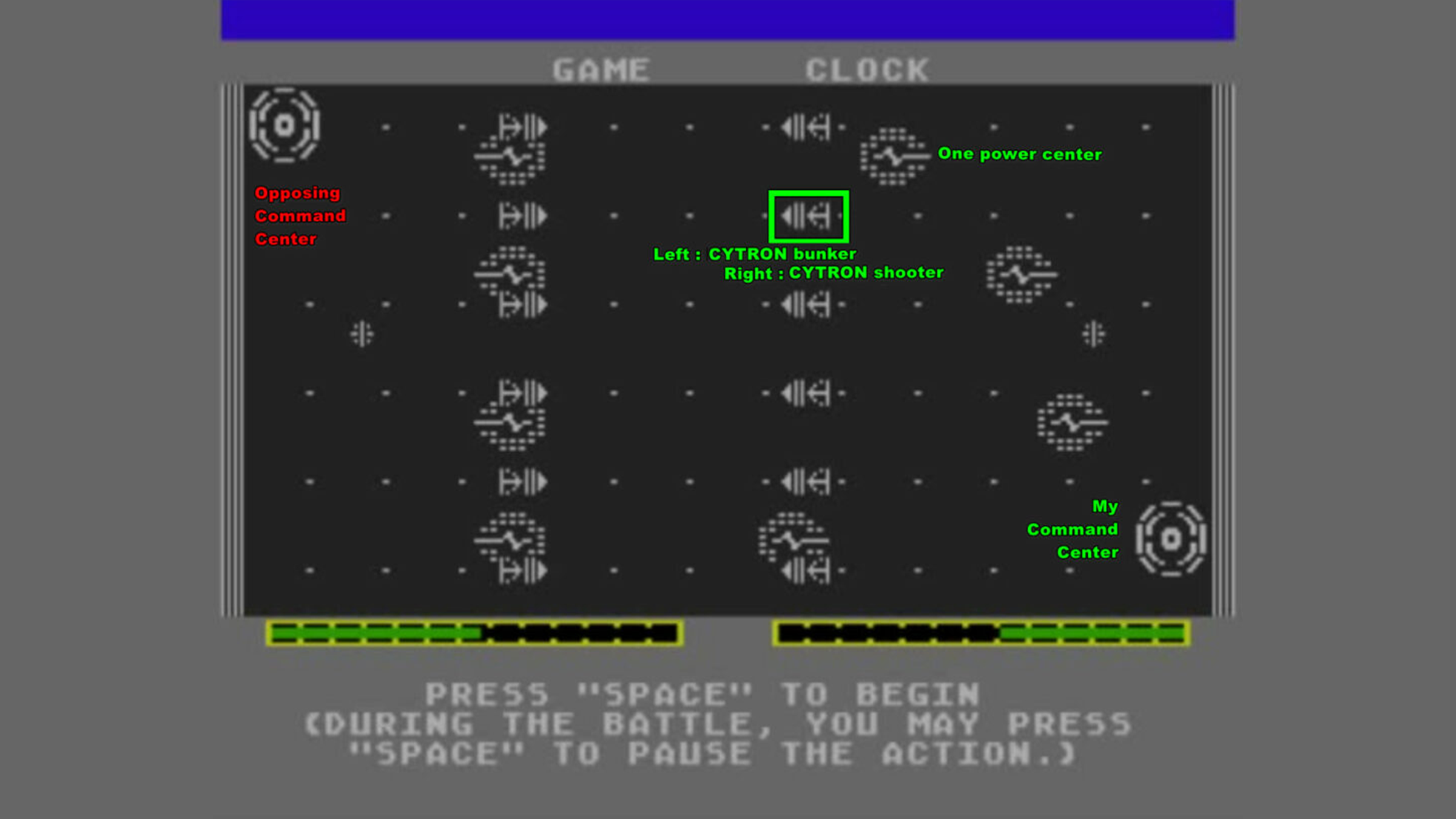 Although earlier games hinted at the real-time strategy (RTS) genre, Cytron Masters is widely considered the first true RTS game. It also included basic real-time tactics, making it a precursor to that genre as well. Released for the Apple II and Atari 8-bit computers, the game challenges players to build up their armies and defeat their opponent. Players start with a command center on opposite sides of the screen, powered by generators that create energy. This energy is the key resource used to build different units and engage in combat.