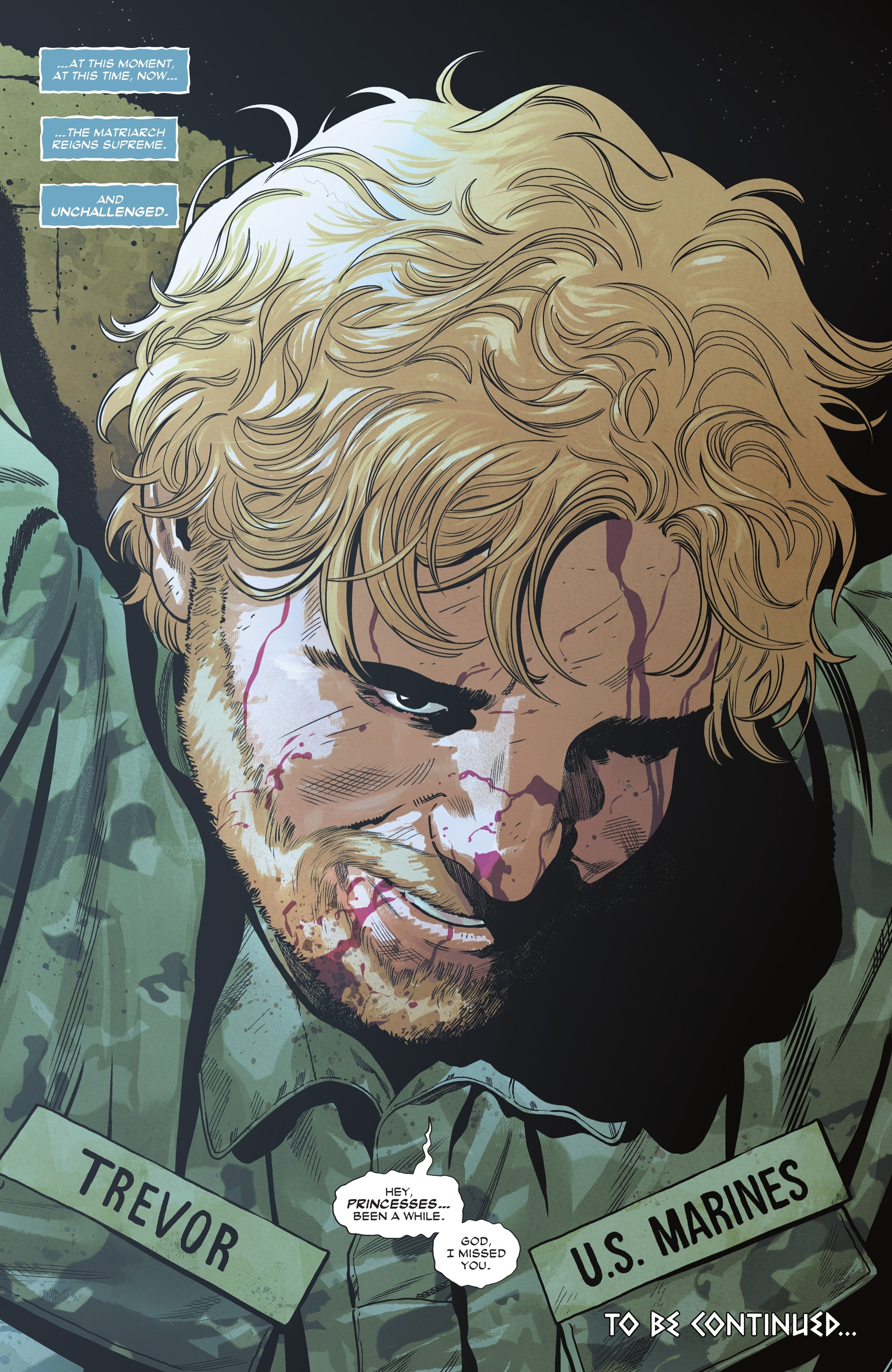 The interview wraps up with Matriarch learning that Themyscira has been invaded, and Wonder Woman and Trinity have defeated many of the attackers. Lyssa immediately ends the interview and deals with the reporter who conducted it – by killing them. Meanwhile, on Themyscira, Diana and Lizzie reach the fortress and discover Superman is being held captive. However, Wonder Woman wasn’t actually looking for Superman; she was searching for Steve Trevor, who is surprisingly still alive. Though injured and bruised, he manages a smile as he’s reunited with the two women he loves.