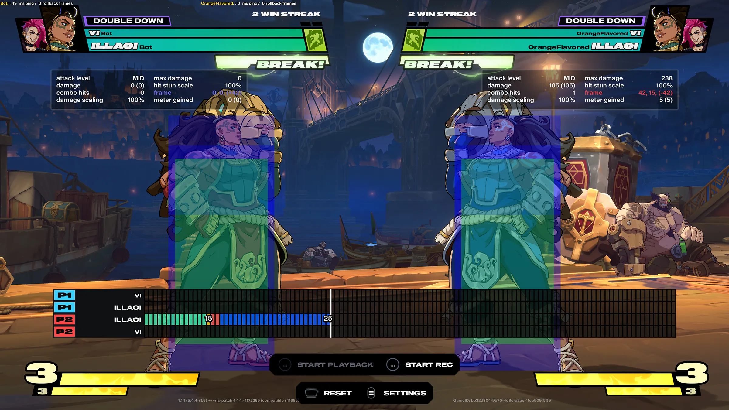 Practice mode is very comprehensive, whether you access it from the main menu or while reviewing a ranked match. It offers a huge number of customizable settings, allowing players to fine-tune their training. For example, you can adjust game speed to learn combos, display frame data, visualize hitboxes, and even control when the CPU will block – giving you complete control over the training environment.