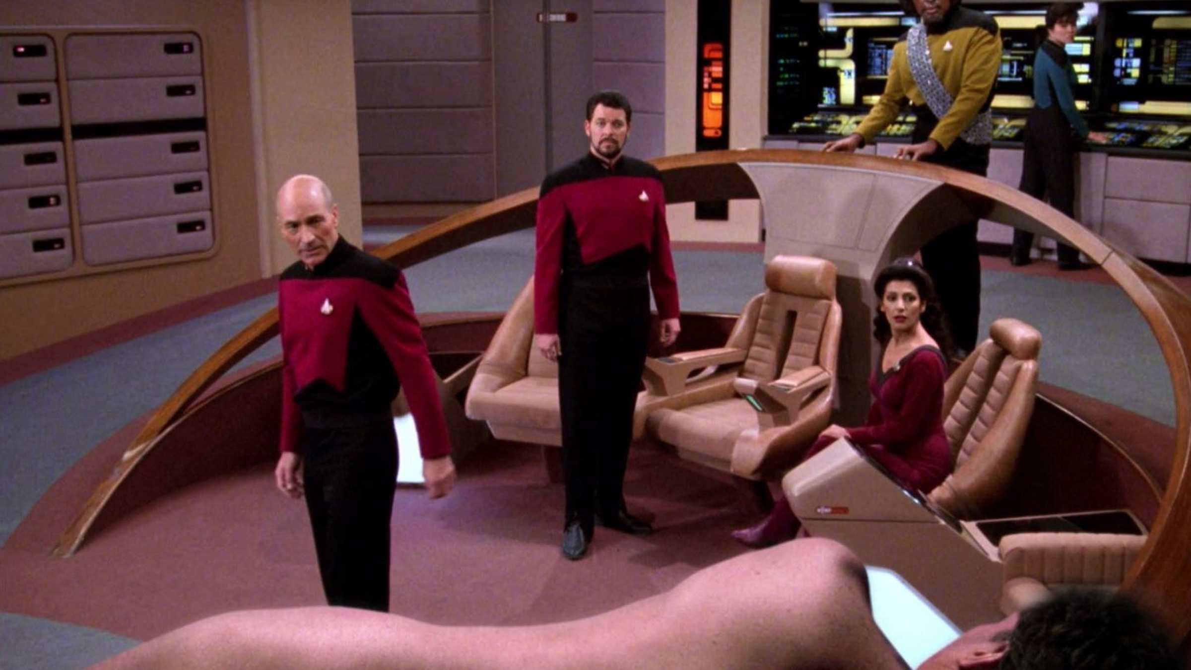 This episode takes a largely humorous look at what happens when Q experiences things like hunger, injury, and fear for the first time. Because Q has always been all-powerful, seeing him vulnerable in “Deja Q” is both surprising and rewarding. The crew’s reactions to a suddenly powerless Q force them to be more patient and, surprisingly, to feel some sympathy for him. It’s one of the best episodes to show Q as a complex character who can grow and change, even if he doesn’t want to. In fact, Q’s actions in this episode are what inspired a famous internet meme.