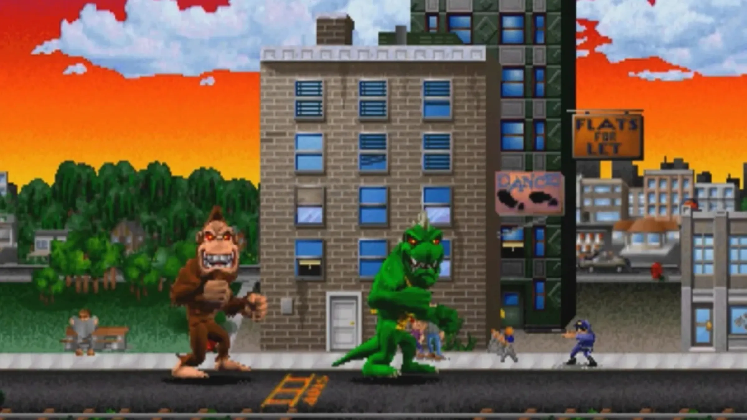 The original arcade game Rampage was created by Bally Midway. When it came to bringing the game to Atari consoles and computers, Activision took over. In Rampage, players become giant monsters, created by a scientific experiment. The goal is to destroy buildings by climbing on them and knocking them down for points, all while avoiding getting shot at.