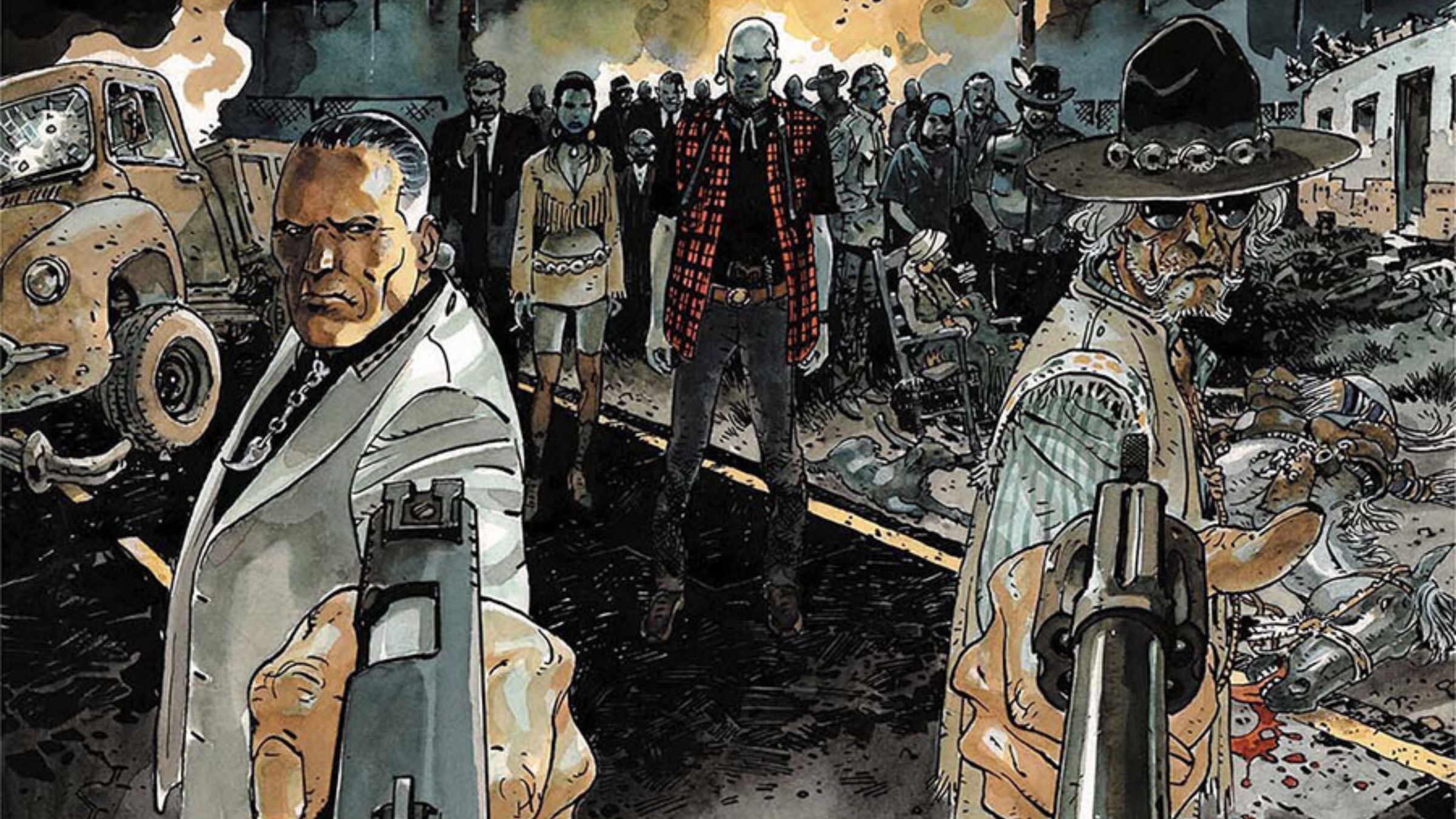 Created by Jason Aaron and R.M. Guéra, Scalped is a 60-issue crime story taking place on the made-up Prairie Rose Indian Reservation. The story follows Dashiell Bad Horse, an FBI agent working undercover, as he returns to the Oglala Lakota community he left behind to investigate Lincoln Red Crow, a powerful crime boss and tribal leader. Scalped is a complex, gritty story that explores the connections between poverty, crime, and what it means to be Native American. The way the story unfolds over many issues lets readers experience both the excitement of the investigation and the long-lasting effects of past trauma on the reservation’s people.