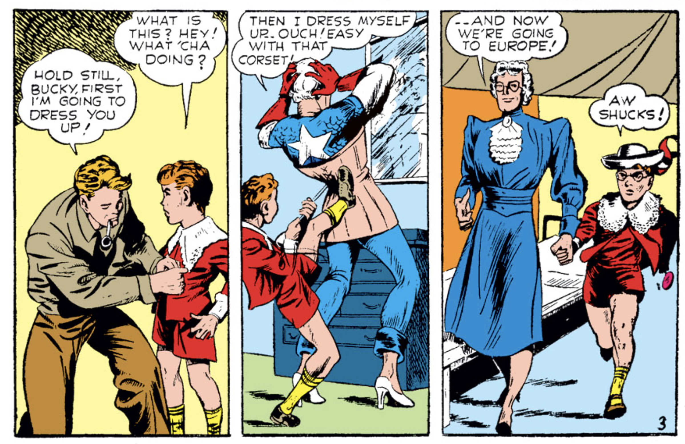This story takes us back to the beginning of Captain America comics, many of which focused on World War 2. In this particular issue, a wealthy but shy man who was planning to financially support Britain’s fight against the Nazis is kidnapped by the enemy, right in front of Captain America and Bucky. To rescue him, Captain America devises a daring plan: he and Bucky will travel to Europe in disguise. Cap will dress as an elderly grandmother, and Bucky will pose as her grandson – back when Bucky was portrayed as a young sidekick.