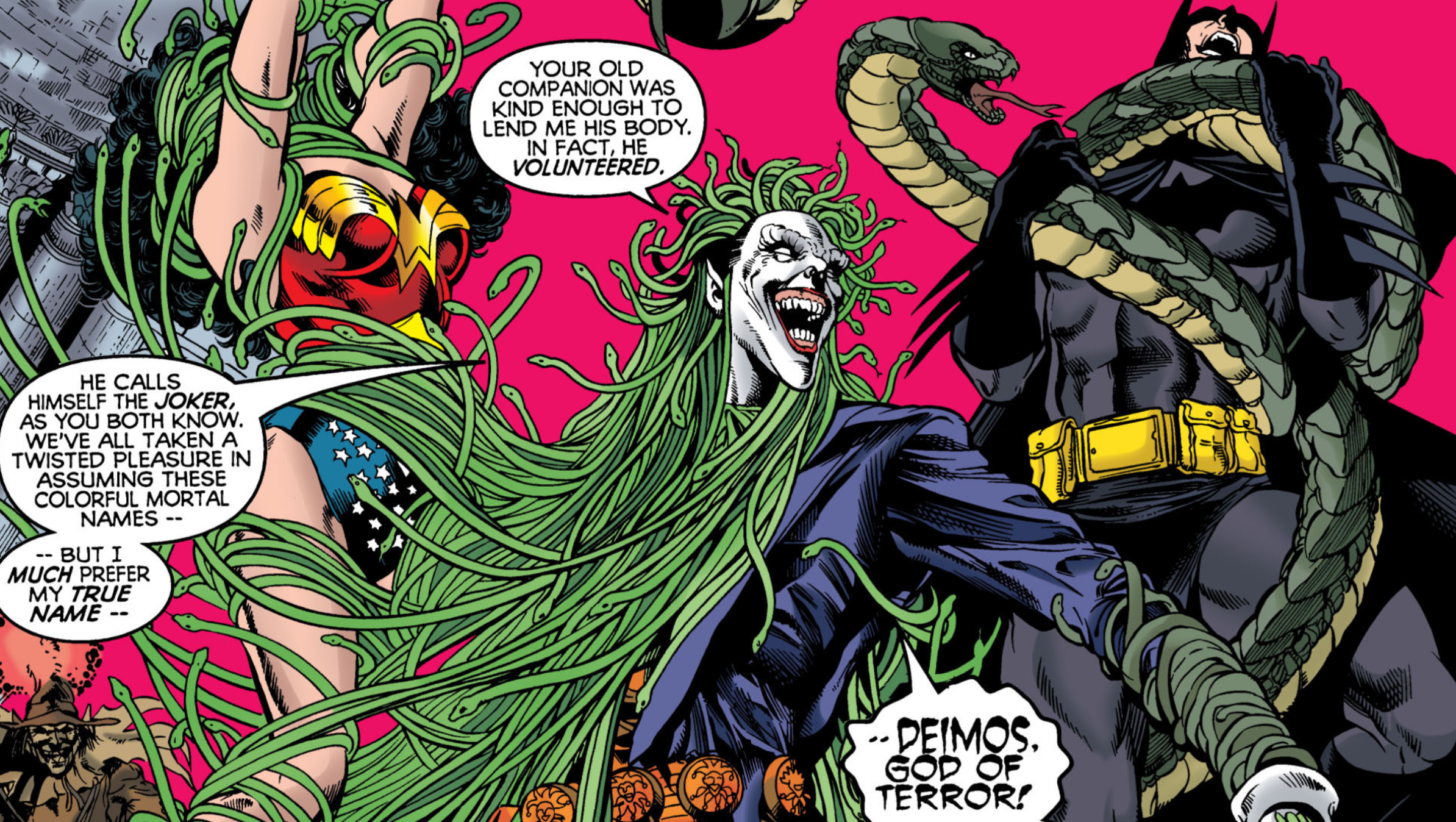 Eris, Phobos, and Deimos – gods seeking their father Ares’ approval – decided to cause trouble by taking control of Gotham’s villains. Eris possessed Poison Ivy, Phobos took over Scarecrow, and Deimos inhabited the Joker. This transformation turned the Joker into a monstrous figure with a snake-like tail and hair that could trap even powerful heroes like Wonder Woman. Because of Phobos’ influence, the Joker could also inflict intense fear on anyone he targeted. Although Deimos and the Joker struggled for dominance, they both craved widespread devastation. However, Ares disapproved of his children controlling humans and ultimately freed the Joker by expelling Deimos.