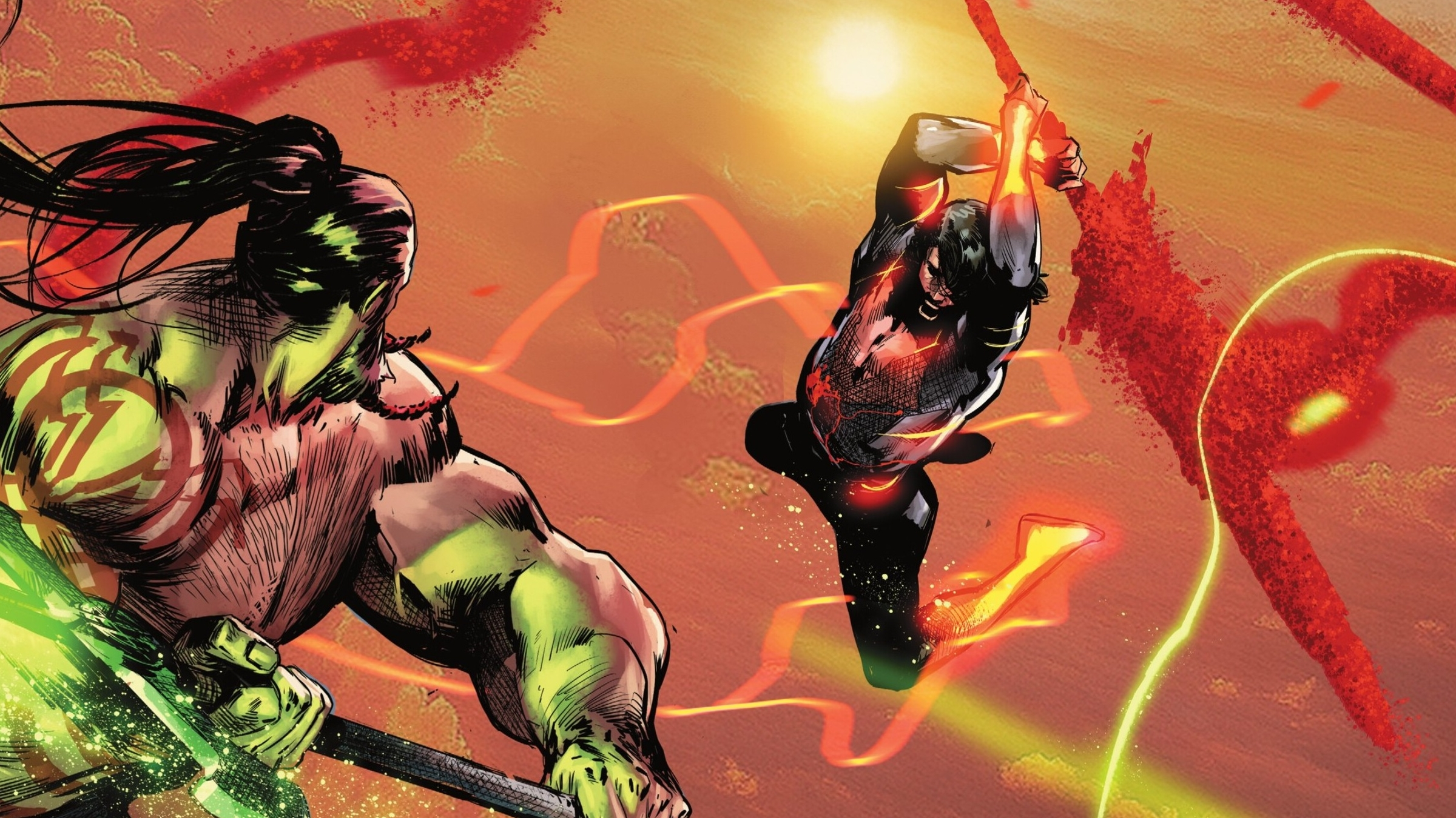 Ra’s asks Superman to abandon his past, and Superman agrees, even removing the iconic ‘S’ shield from his suit, which crumbles into dust. However, Superman realizes Ra’s still intends to destroy Smallville. He explains that while his family’s crest once symbolized shame on his home planet, they always wore it with pride. Using his powers, Superman reshapes the broken pieces of a sword into a massive blade, matching the power and scale of Ra’s al Ghul’s kryptonite weapon.