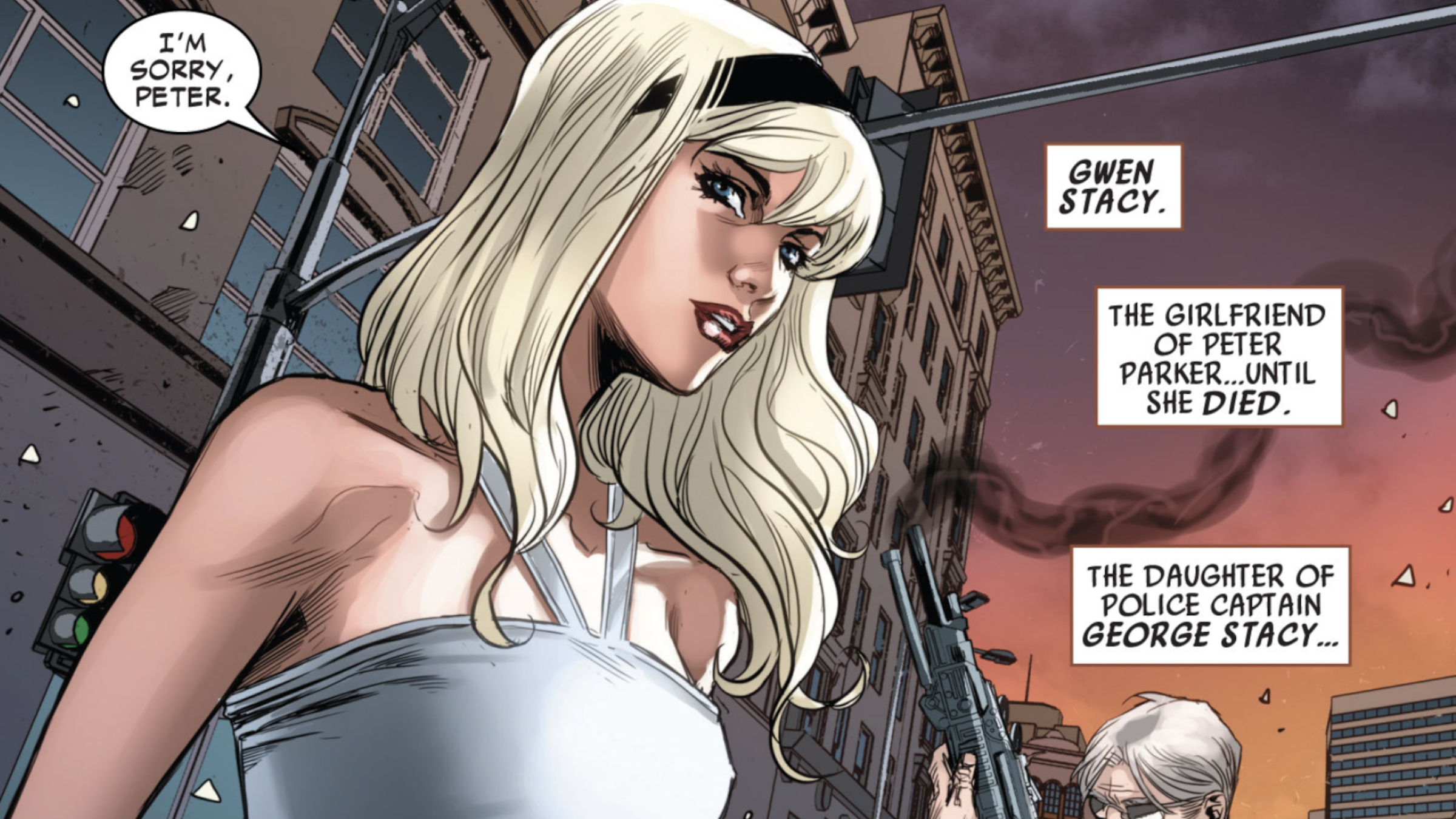 During the AXE: Judgment Day event, a powerful being called the Progenitor evaluated all of humanity. For Peter Parker (Spider-Man), the Progenitor appeared as Gwen Stacy, observing his life after her death. Through Gwen’s eyes, the Progenitor assessed the person Peter had become. Haunted by her ghostly presence, Peter continued his life, but finally said all the things he’d kept bottled up. He forgave his former boss, Jonah Jameson, told Miles Morales how proud he was to share the Spider-Man mantle, and explained his decision to give Norman Osborn another chance. Ultimately, Peter was the one being judged, and his reward was a brief, emotional reunion with Gwen. They shared how much they missed each other before she disappeared once more.