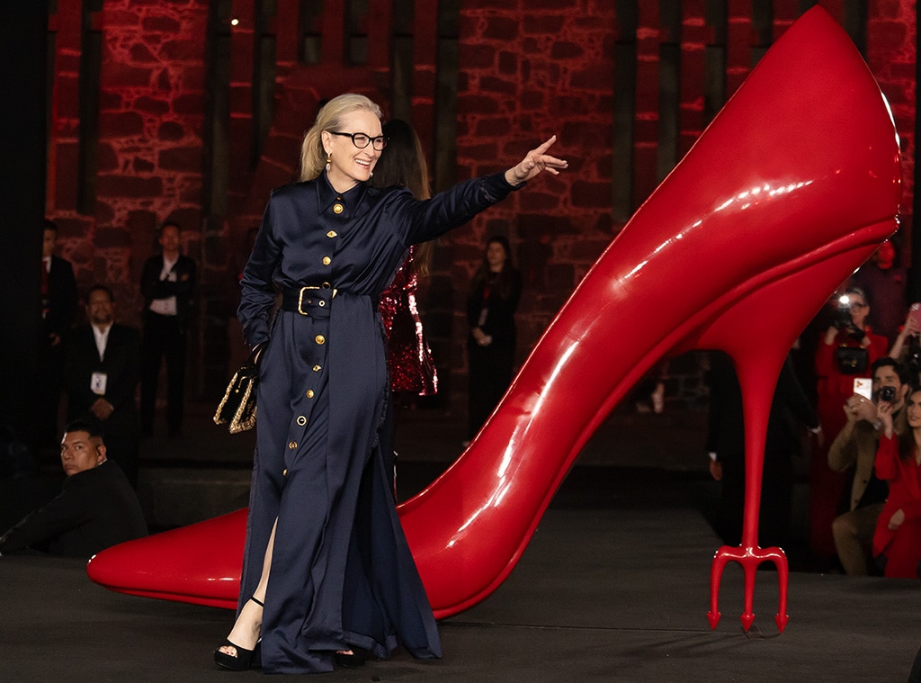 Meryl Streep, known for her role as Miranda in Runway, kicked off a trip in Mexico City on March 30th with a striking all-red suit by Dolce & Gabbana. She started at La Casa Azul, the home of Frida Kahlo, and the suit featured a satin bow at the neck.