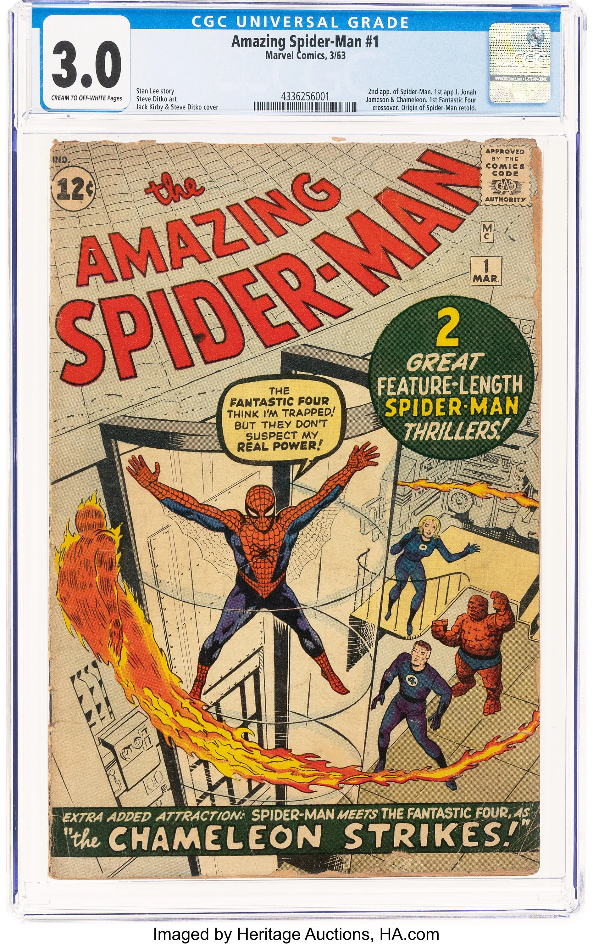 A copy of The Amazing Spider-Man #1 is currently being auctioned by Marvel. It’s in relatively good condition, graded at 3.0, and features the first appearances of J. Jonah Jameson and The Chameleon, as well as Spider-Man’s second appearance. While the cover has some wear and tear—including creases and tears—it’s a significant piece of comic book history. The current high bid is $5,250, and the auction continues for another 13 days.