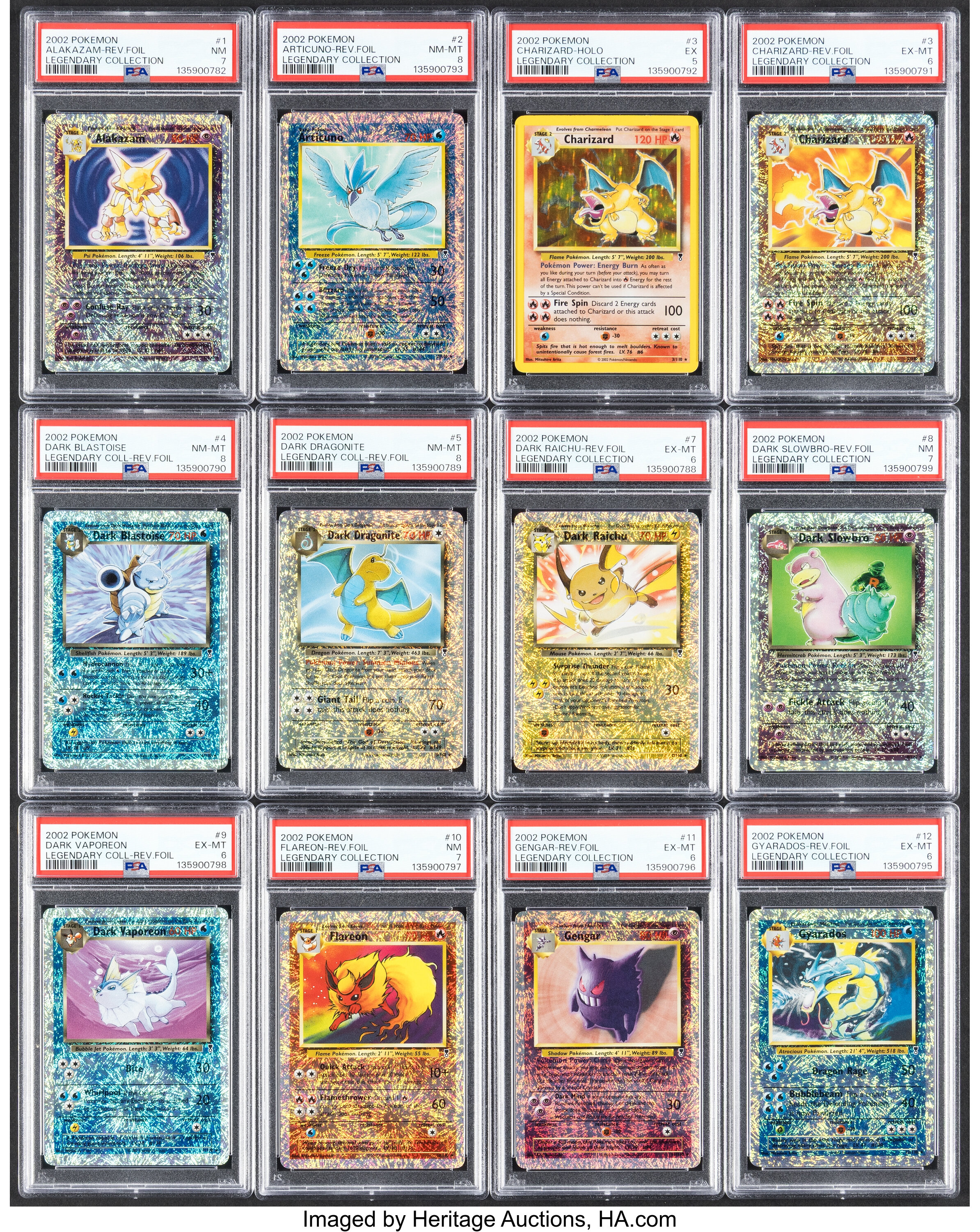 Let’s look at Pokémon trading cards. This auction features a complete Legendary Collection Master Set, including the 100-card base set, the 110-card reverse holo set, and 4 special box topper cards. PSA has professionally graded 40 of the cards, with the Reverse Holo Dark Blastoise, Reverse Holo Dark Dragonite, and Charizard all receiving a near mint grade of 8 out of 10. Bidding is currently at $1,350, and the auction has 27 days remaining.