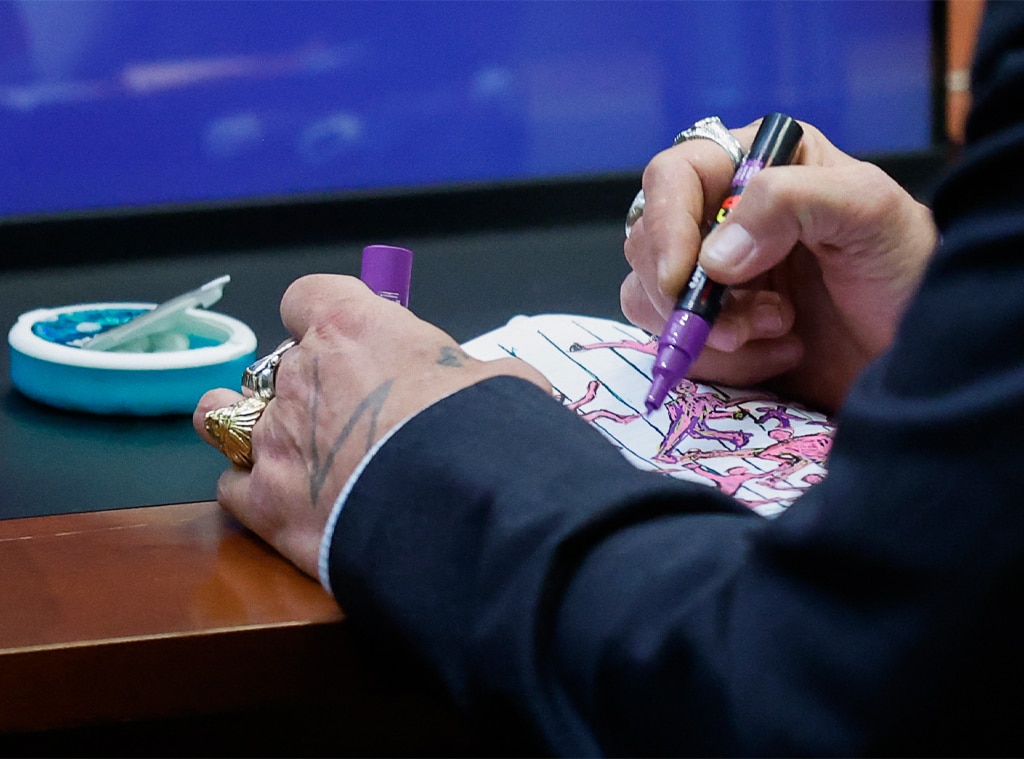 During a court hearing on April 27th, Johnny Depp was observed sketching on a sticky note and handing it to his lawyer. A video shows the lawyer putting on glasses to look at the drawing, then nodding as Depp quietly spoke to him.