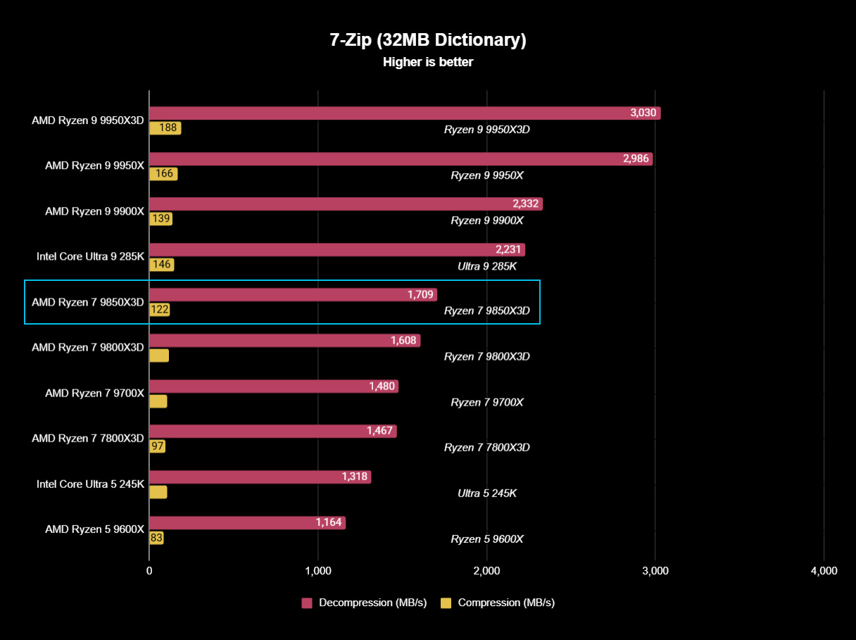 The Ryzen 7 9850X3D performed exceptionally well in single-core tasks, but didn’t stand out in other tests. It scored about 5% better than the 9800X3D in standard productivity tests. For creative work, the Ryzen 9 9900X is still the better choice, and at $382 from Newegg, it’s a great value – especially if you’re not primarily focused on gaming.