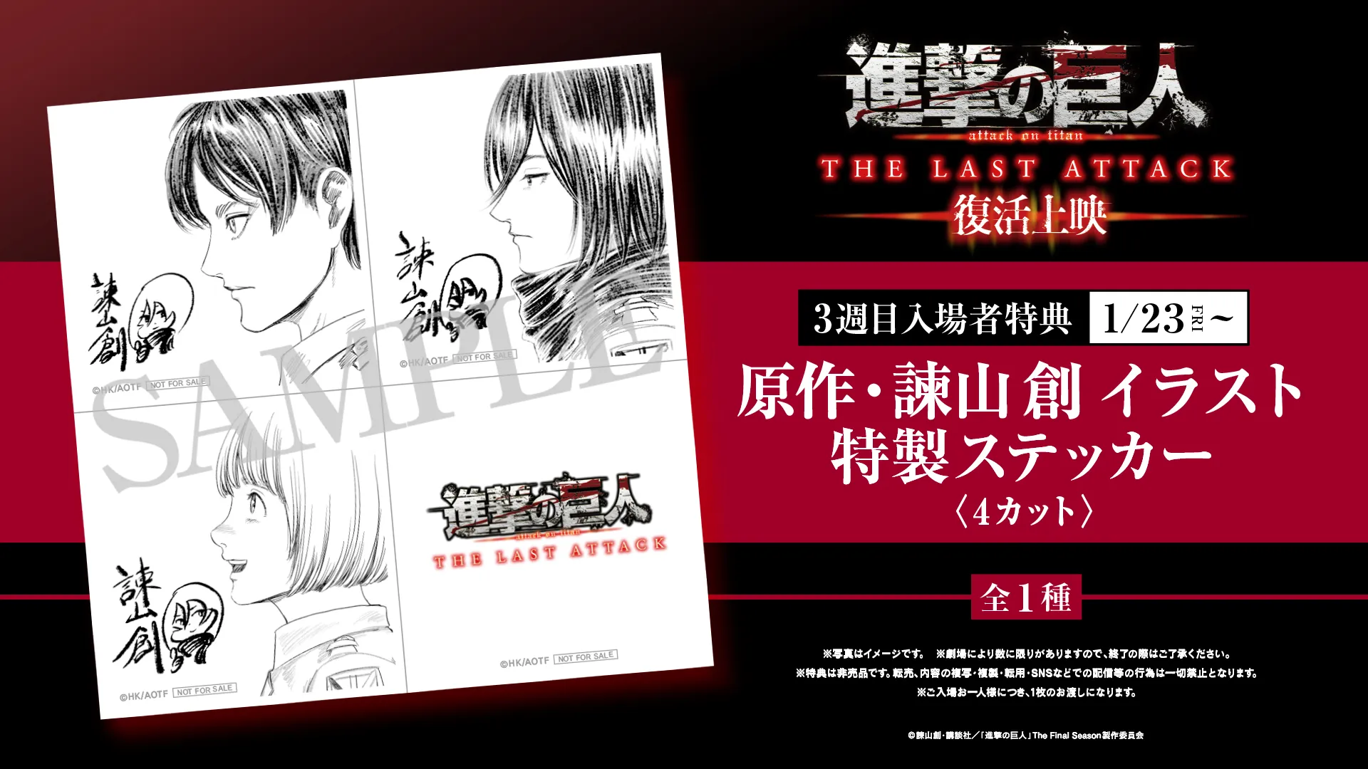 The anime focuses on Eren, but his friends Mikasa and Armin are also central to the story. To celebrate the anime’s re-release in theaters, fans who attend screenings will receive a different bonus item each week. This week’s bonus is a brand new illustration by the creator, Isayama, showing Eren, Mikasa, and Armin looking out into the distance. These limited-edition visuals will be available starting on the 23rd, while supplies last, so fans are encouraged to get them quickly.