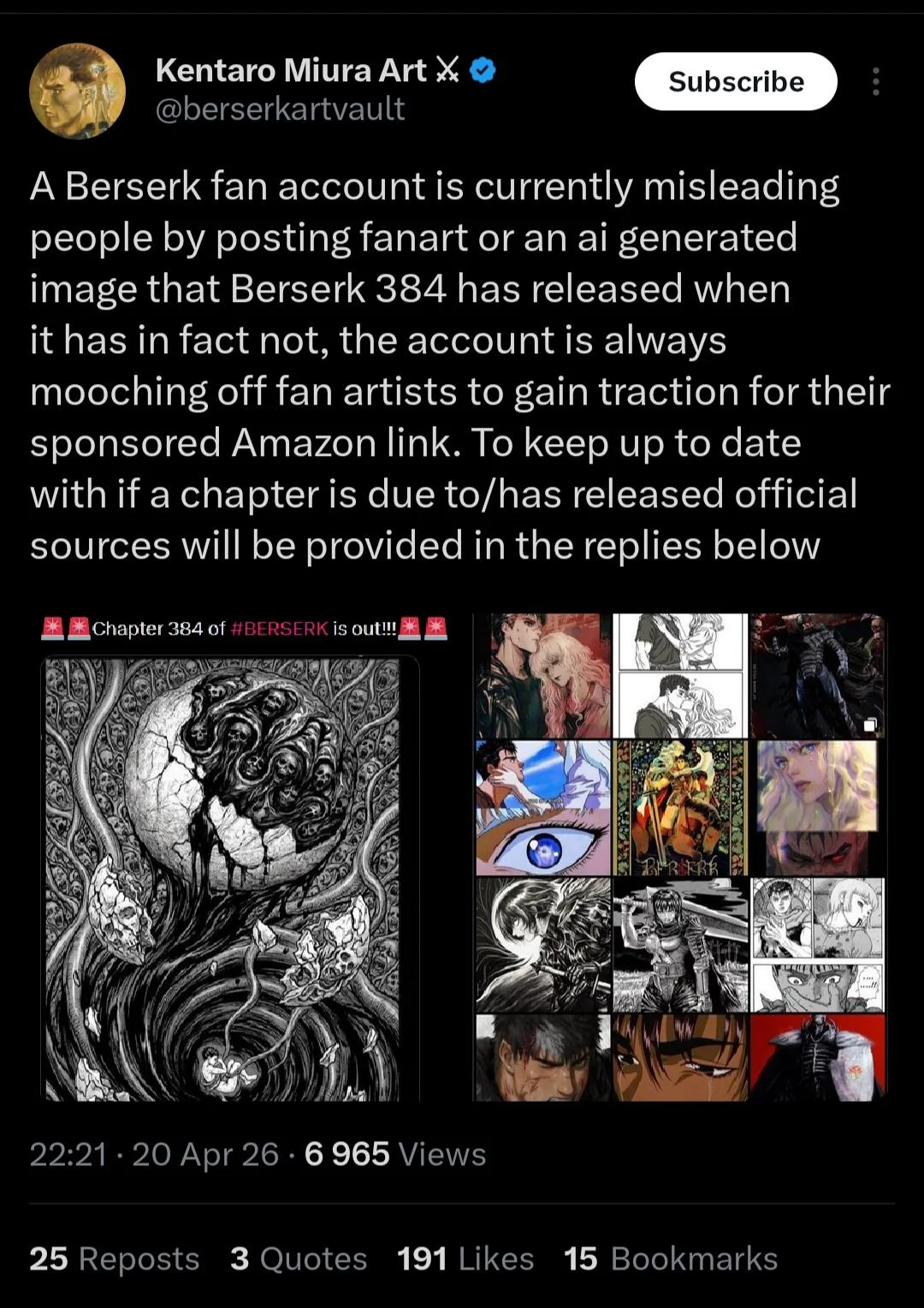 A social media account on X recently shared artwork claiming it was chapter 384 of the manga Berserk, but fans quickly pointed out that this is false – the next chapter hasn’t been released yet. The user appears to have used artificial intelligence to create the images, which show a younger Guts revisiting memories. As of now, the publisher of Berserk, Young Animal, hasn’t addressed the situation, but fans are working to debunk the misinformation caused by this AI-generated art.
