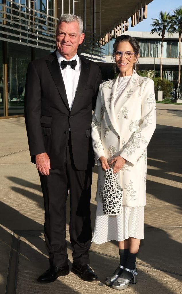 Actress Dina Meyer, known for her role in Lost Boys, stepped out with her husband, Tony Ressler, at the opening gala for the new David Geffen Galleries at the Los Angeles County Museum of Art on April 16th. Meyer wore a white outfit with a floral coat from Libertine and a studded bag by Khaite, while Ressler looked sharp in a classic black tuxedo.
