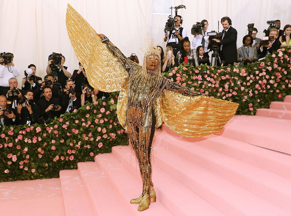 Billy Porter made a grand entrance at the 2019 Met Gala, which had a “Camp: Notes on Fashion” theme. He dressed as an Egyptian god, sporting a dazzling all-gold outfit with wings and an elaborate chain headdress. To complete the spectacle, he was carried onto the red carpet on a platform by six men wearing gold pants.
