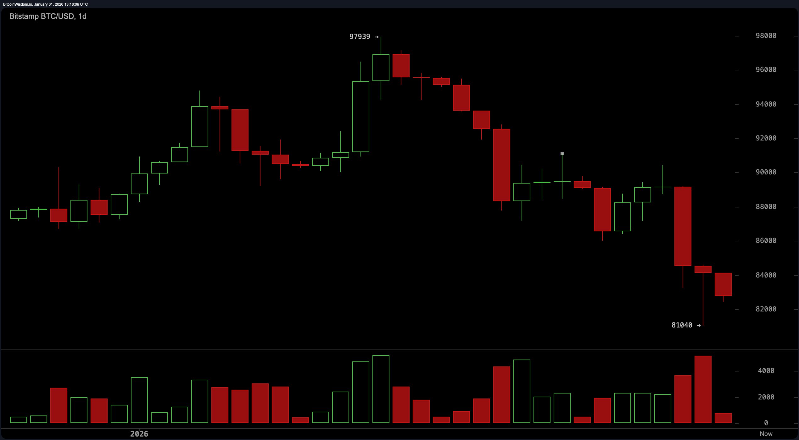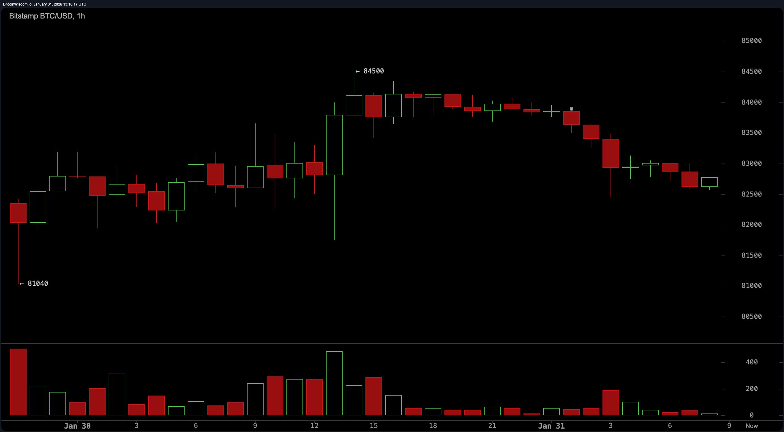 On the morrow of January 31, 2026, Bitcoin awoke with a countenance as somber as a Russian winter, its once-proud market capitalization of $1.65 trillion now a mere shadow of its former glory. Priced at $82,699, it wandered aimlessly within the confines of $81,953 to $84,367, its daily volume a paltry $53.64 billion-a sum that, while ample, lacked the conviction to dispel the bearish gloom. From the charts, it is clear: Bitcoin is a wounded beast, its path to redemption as uncertain as a Tolstoy novel.