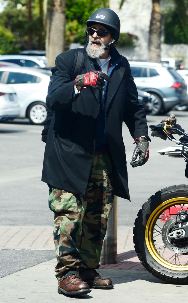 I always notice what Mr. Nelson wears when he’s out and about, and his trip on April 13th was no exception! He had on this cool black trench coat over a gray shirt, and paired it with camo cargo pants. He looked ready for anything! Of course, he always gears up properly when he rides – backpack, helmet, and gloves were all part of the look as he got ready to hop on his motorcycle.