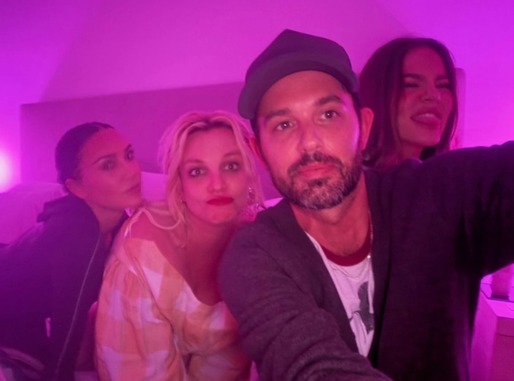 Kim Kardashian shared a fun photo on Instagram of herself and Britney Spears hanging out with friends. The group took a selfie in bed, with Britney, 43, sticking her tongue out and wearing a yellow top. Kim, wearing a dark hoodie, gave a peace sign and captioned the picture “Calabasas Nights.”
