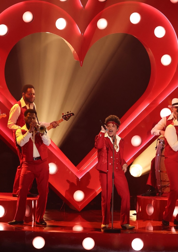 Bruno Mars, performing with his band the Hooligans, delivered an energetic performance wearing a red suit and headband. He previewed a song from his new album, The Romantic, which will be released on February 27th, while standing on a heart-shaped stage.
