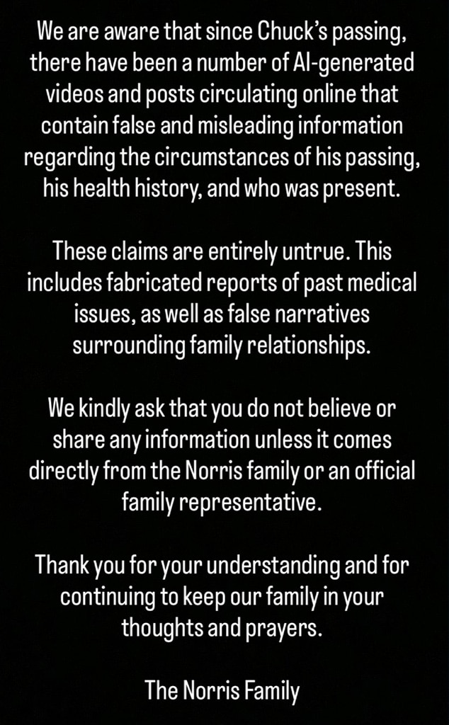 The family of Chuck announced on his Instagram Stories on April 1st that they are aware of several AI-created videos and posts spreading false and inaccurate information online about how he died, his medical background, and who was with him at the time.