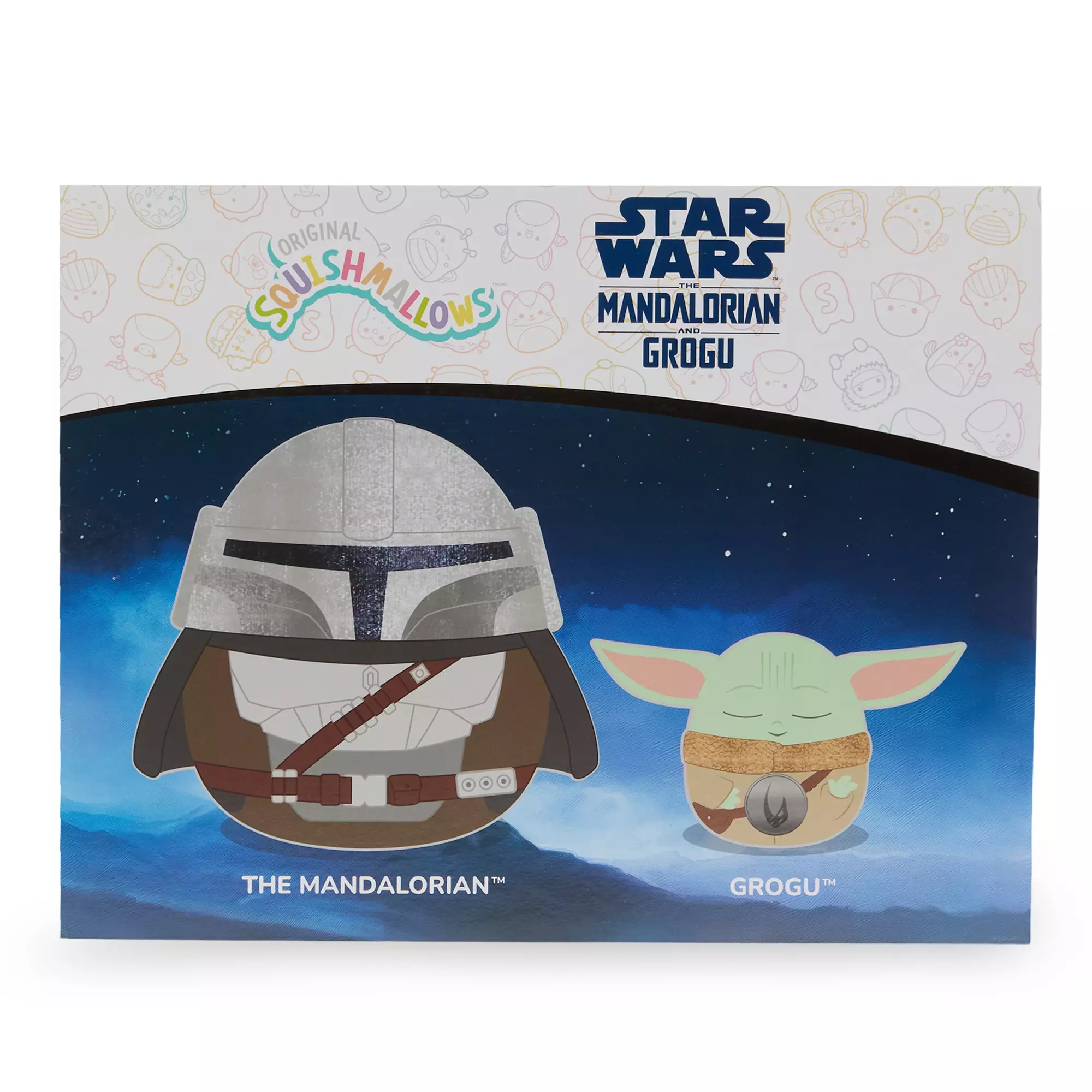 This set of two Squishmallow pillows features the beloved characters Mando and Grogu in super-soft form! Mando is wearing his helmet, showing off his Mandalorian armor as a Squishmallow, and Grogu, much smaller in size, appears to be either sleeping or practicing his Force abilities with his eyes closed. At $34.99, this exclusive set is a fantastic choice for both Star Wars enthusiasts and Squishmallow collectors.
