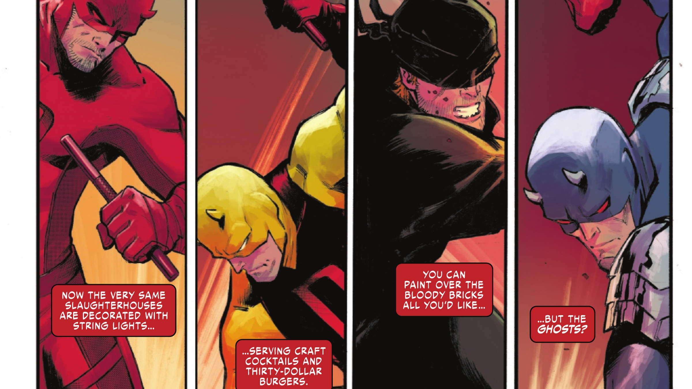 Garbett’s work on this issue is fantastic. The artwork and environments perfectly capture the feel of a Daredevil comic. What really stands out, though, are the action sequences. From car chases to hand-to-hand combat, everything is dynamic and flows incredibly well. While we’ve come to expect impressive fight scenes from Daredevil’s TV shows, this comic delivers equally thrilling confrontations. If you’re looking for intense action, this issue doesn’t disappoint, and it’s sure to appeal to fans of the Born Again storyline.