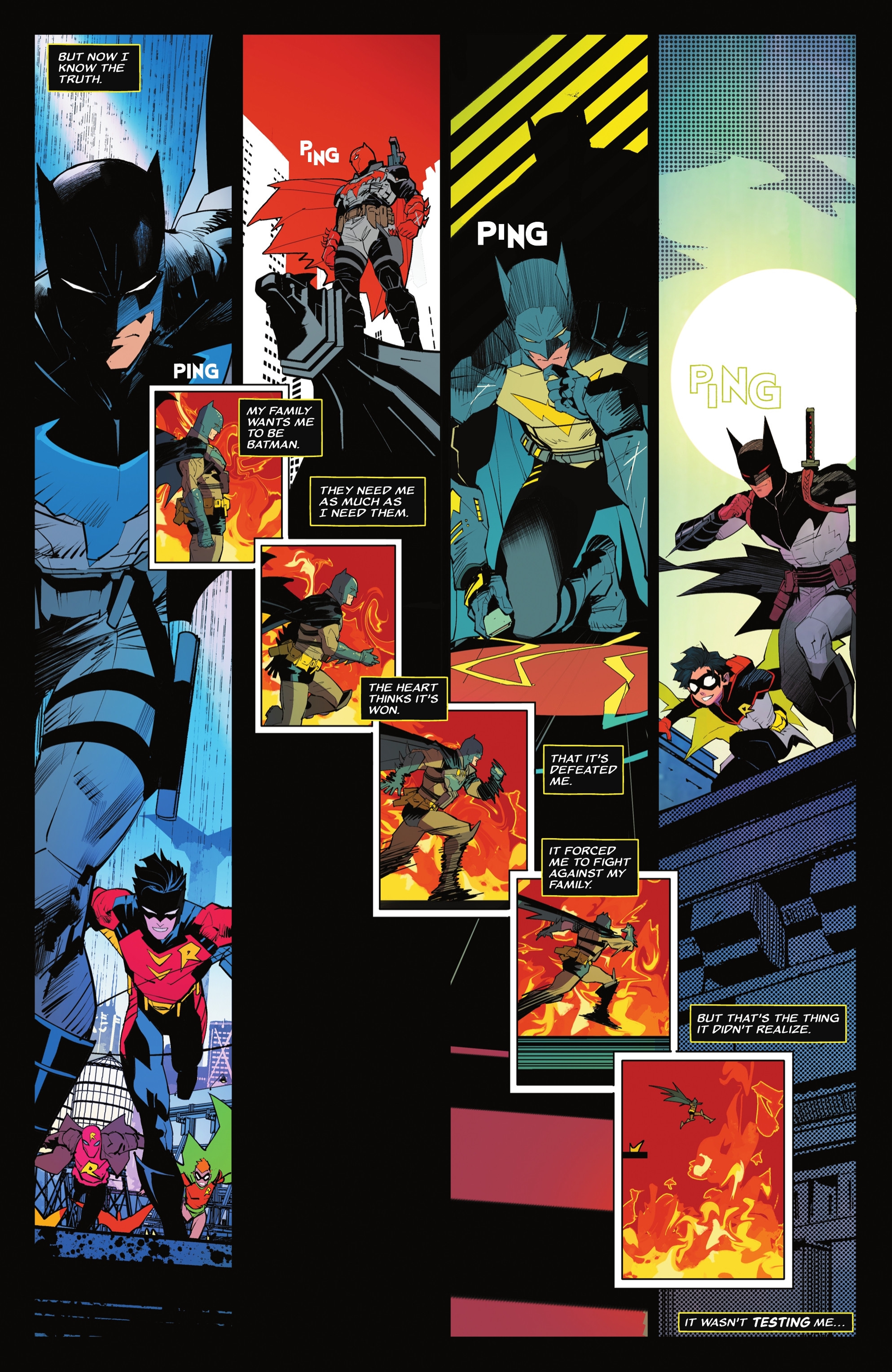 The fight starts cautiously, with both Batman and Damian testing each other. Eventually, they unleash their full power, and after a long battle, Damian defeats Batman. However, the true goal wasn’t victory, but to see if Bruce would acknowledge defeat. The entity known as the Heart pulls Batman into a strange emptiness, but not before Bruce instructs Damian to open the Bat-Box. As Bruce prepares to return to the fight, sounds – ‘pings’ – echo from the four alternate realities he experienced in DC K.O. Knightfight, suggesting he managed to save the four other versions of Batman.