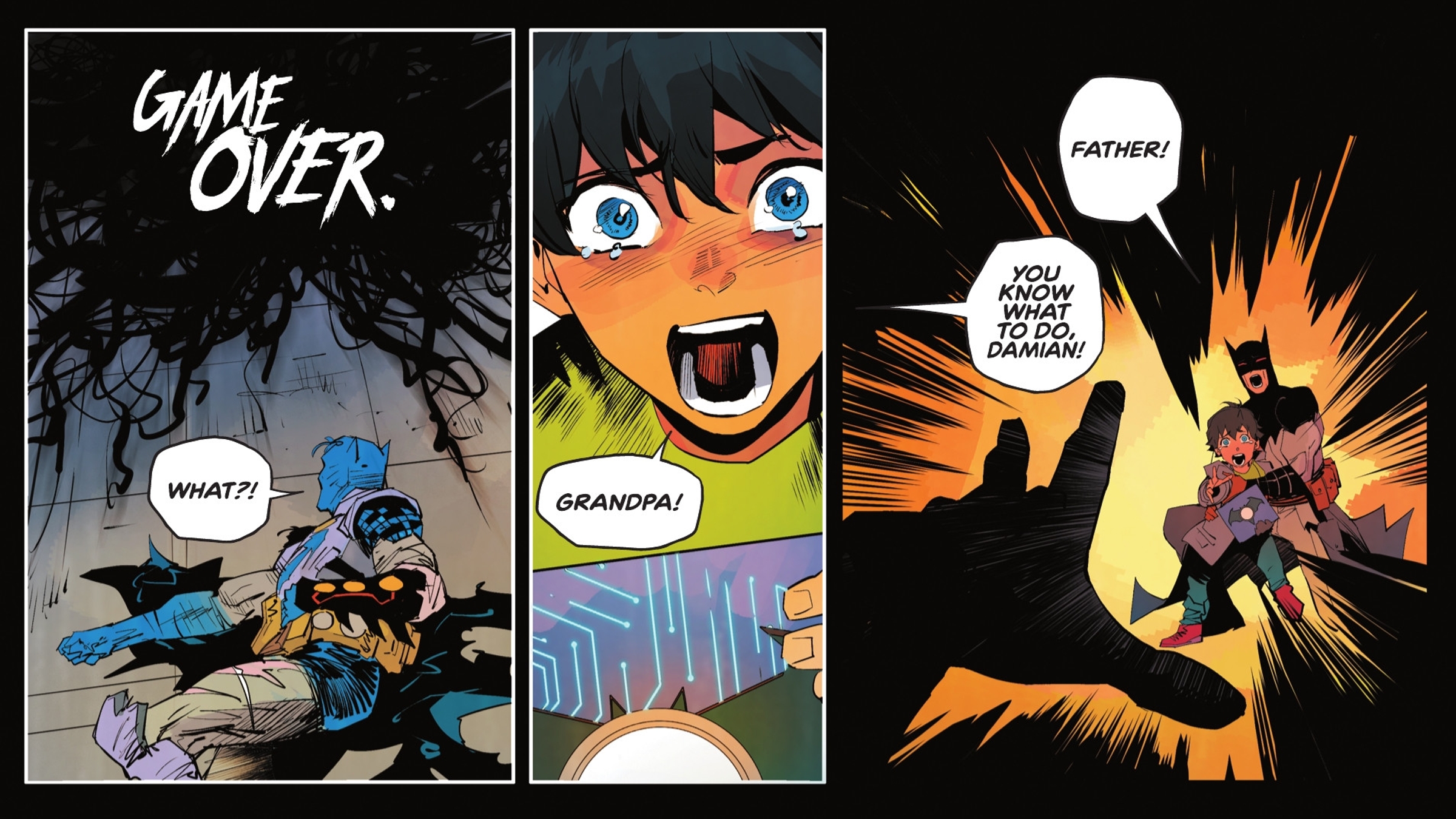 In issue #4 of DC K.O. Knightfight, written by Joshua Williamson with art by Dan Mora, colors by Triona Farrell, and lettering by Tom Napolitano, Bruce Wayne spends a significant amount of time in this simulated world. He witnesses the positive changes Damian has made to the city and gets to know his grandson, Alfred Wayne. Despite enjoying this reality, Batman understands that the Heart of Apokolips requires a confrontation, and that’s the only way to return home. Preparing for the coming battle, Bruce enlists the help of the Bat-Family, who agree to both protect this world and find a path back to their own.