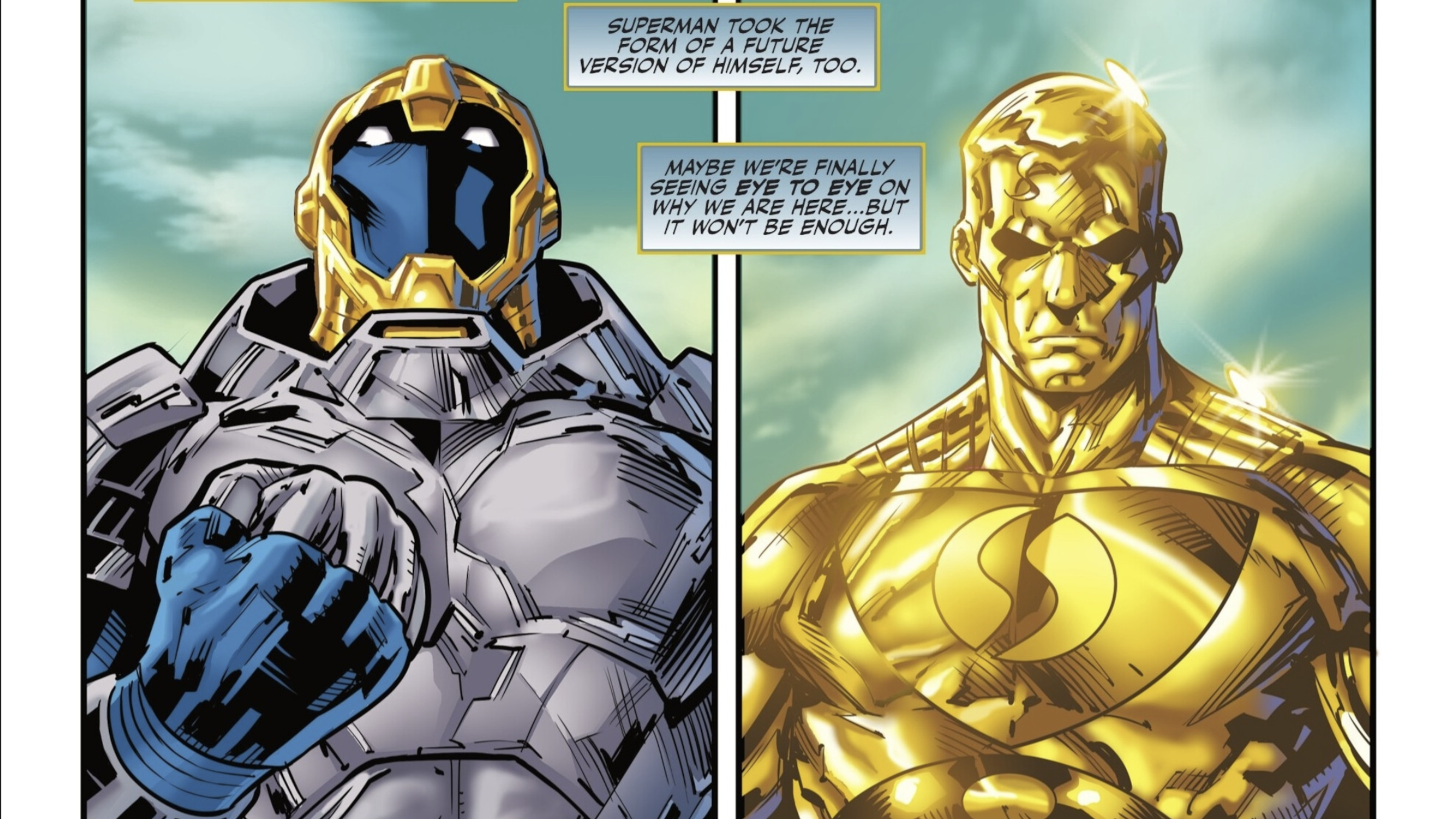 The second round began with Superman and Captain Atom suddenly appearing in a deserted Metropolis, courtesy of the Heart of Apokalips. While Superman immediately started looking for survivors, Captain Atom attacked him without hesitation. He won the first clash by completely draining Superman’s energy, turning him to dust. The Heart then brought Superman back and gave both heroes the opportunity to transform into different versions of themselves from across time. Captain Atom became the incredibly powerful Monarch, who can control time and reality. Hoping for a different outcome, Superman transformed into Superman Prime One Million, a future version of himself with immense power.
