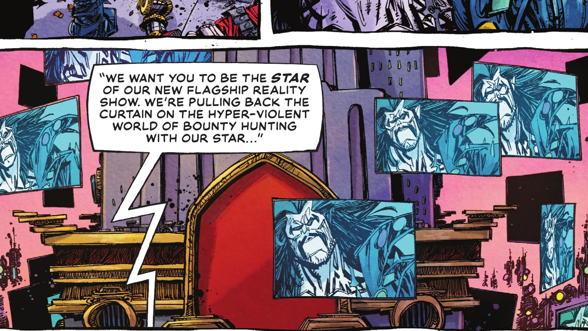 Lobo goes to Omni headquarters to settle things and meets Mr. Kzzt, who explains he bought the bounty business solely to profit from antiheroes. Kzzt intends to dominate the reality TV world. Lobo is uninterested in anything but getting paid, and vents his annoyance by fighting Kzzt’s security team. Surprisingly, this outburst impresses Kzzt, who offers Lobo a job: starring in a bounty-hunting reality show.