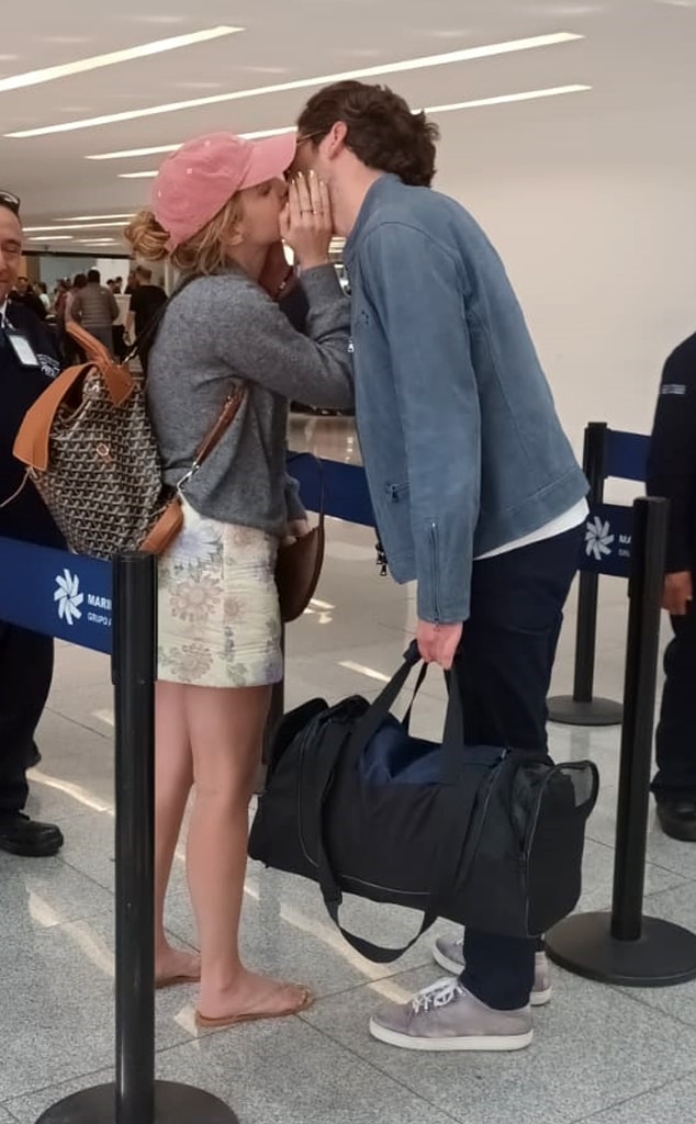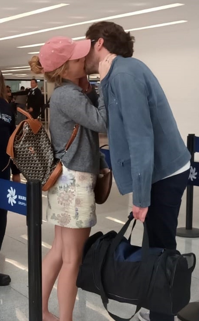 Emma and Gonzalo shared a kiss while waiting in the security line. Emma was wearing a red baseball cap, a floral skirt, a gray top, and had a backpack, and she had her hands on Gonzalo’s neck during the kiss.