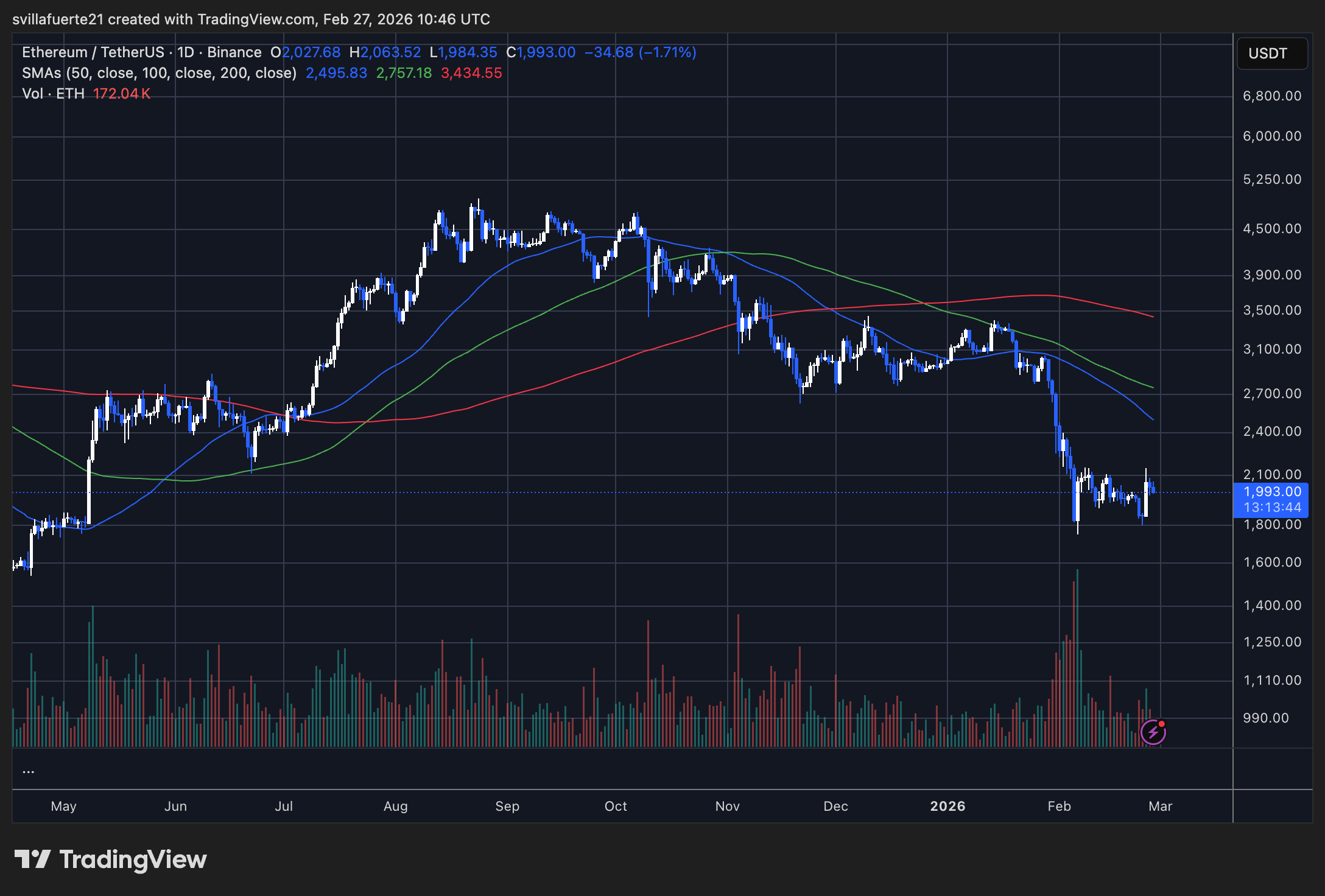 Ethereum’s trading below every moving average you can think of-50-day, 100-day, 200-day-all sloping down. It’s a bear market buffet, and Ethereum’s just the main course. When the 50-day average is dropping like that, you know there’s some serious selling pressure. And yeah, it shows in the volume. When it tanked to that $1,850 zone, it came with a massive spike in volume. Forced liquidations everywhere. But now? Volume’s dropped. Panic is over, but so is conviction. People aren’t exactly rushing to buy, are they?