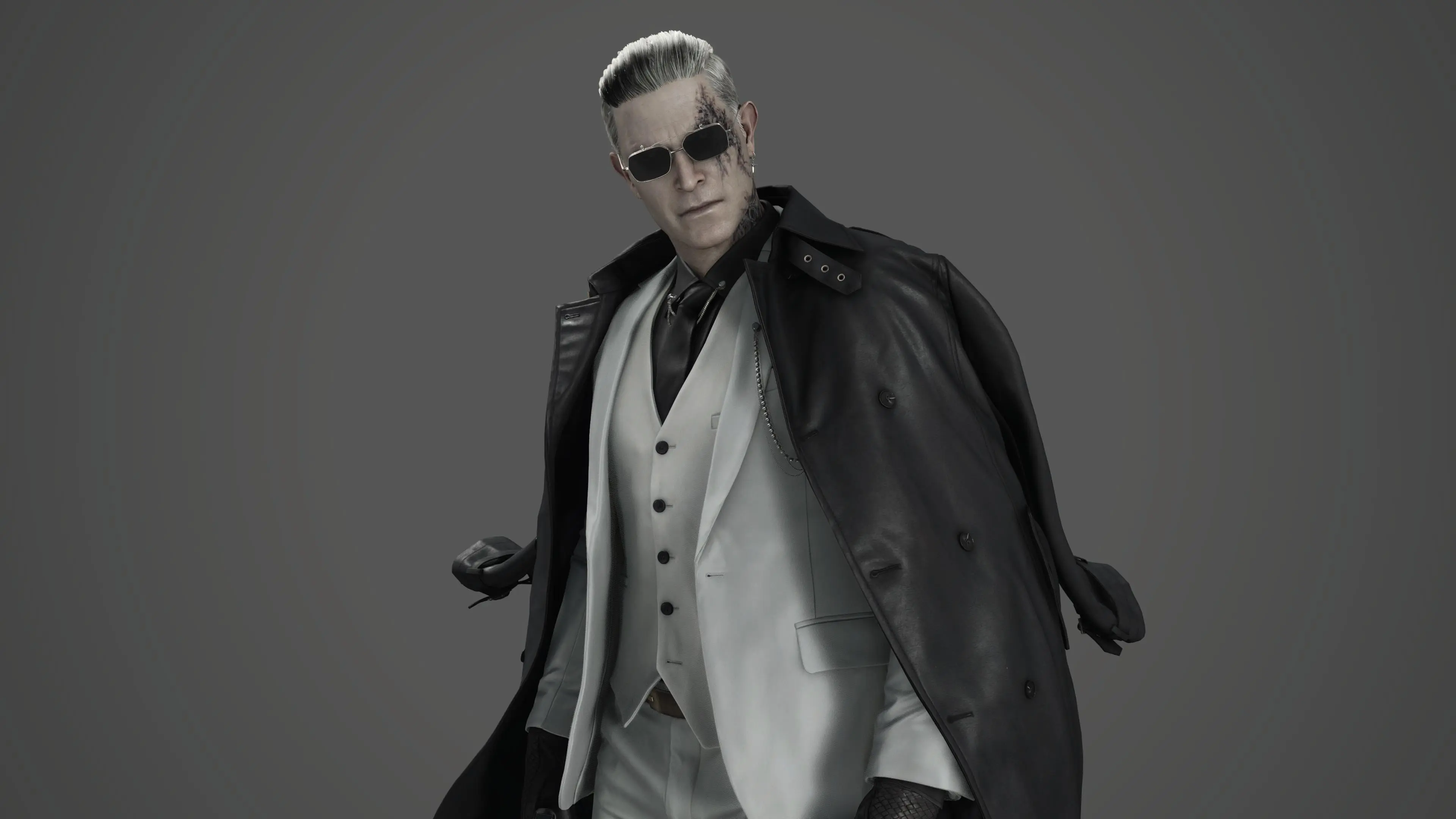 The story hints that Zeno is a clone of Albert Wesker, inheriting all of Wesker’s powers and skills. Like Wesker, Zeno also has a distinctive style, characterized by sunglasses, a white suit, and neatly combed hair.