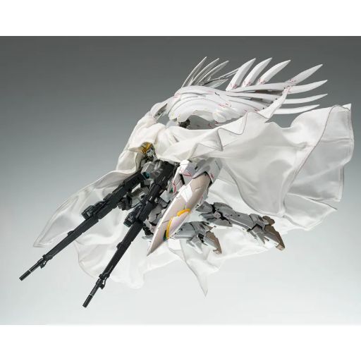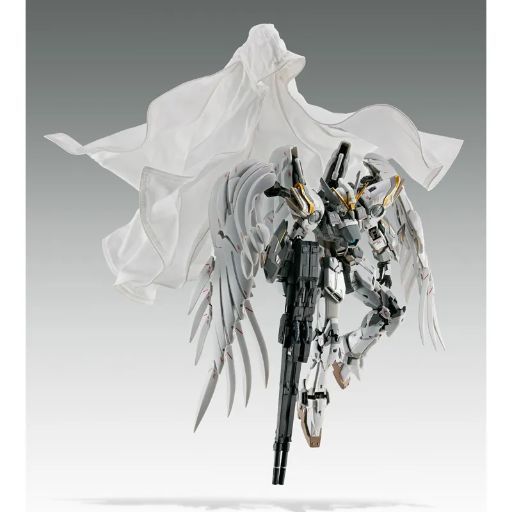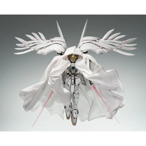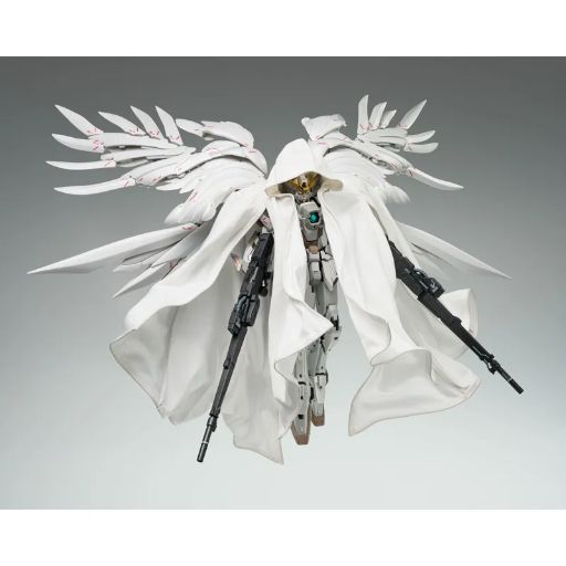 This new Wing Gundam Zero figure isn’t just based on the original anime and its follow-up movie; it’s also inspired by the recent promotional short, Mobile Suit Gundam Wing -Operation 30th, which celebrated the series’ history. Released this year, the short featured a redesigned Wing Zero with a white and grey color scheme, and this figure captures that look. While the overall design, overseen by Hajime Katoki, remains true to the classic fans know and love, the red and blue have been largely replaced with white and grey. Like in Endless Waltz, the wings have an organic feel, but the most striking addition is a dramatic cloak. This cloak is made of a five-part wire cloth and even includes a hood, fully covering the mobile suit and its large wings. The figure is even designed so you can pose it with its weapons while wearing the cloak, just like in the promotional video.