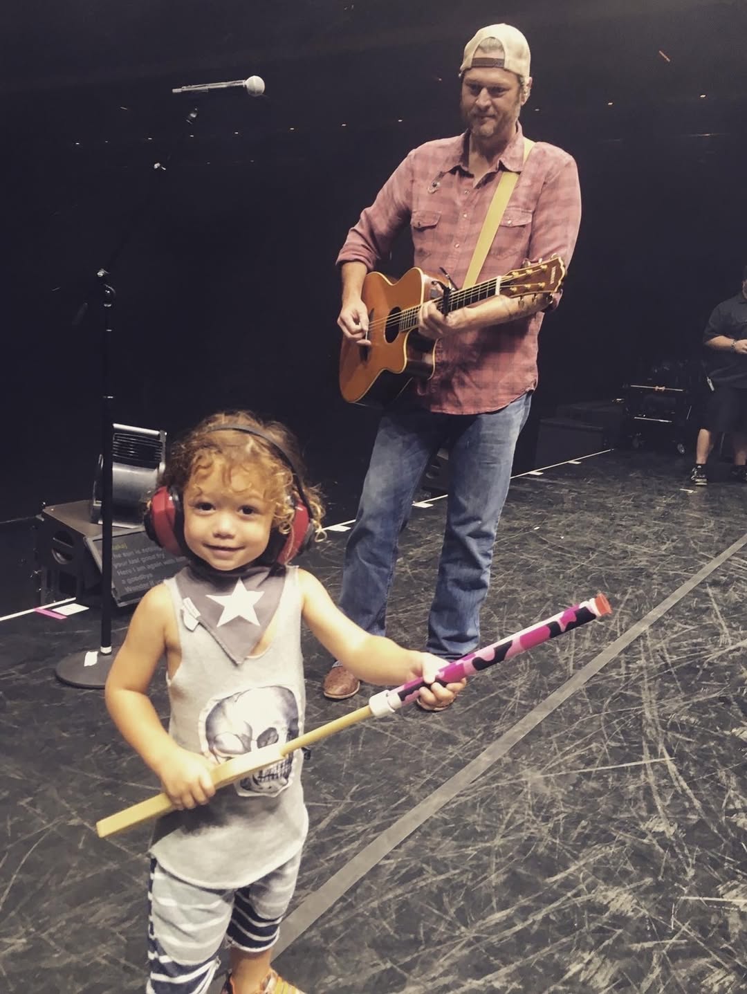 Gwen shared a photo of her youngest son, Apollo, with her husband, Blake Shelton, whom she married in 2021. The picture shows Apollo onstage with Blake, wearing headphones to protect his ears while Blake plays guitar.