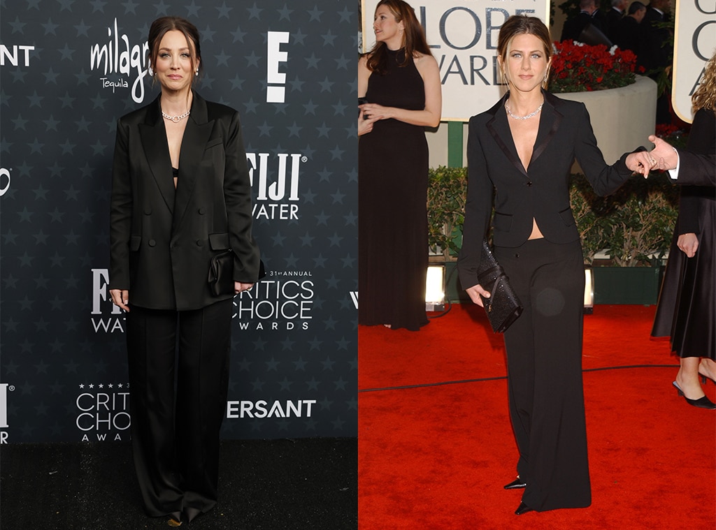 I’ll never forget when Jennifer Aniston wore that outfit! It was so daring – trousers and a black blazer, but she didn’t wear anything under the blazer, showing off a really low neckline. The blazer itself was cropped, which made it even more striking. She completed the look with pointy black heels, a big black clutch, and styled her hair in a messy updo – her dirty blonde locks looked amazing! It was such a confident and iconic moment.