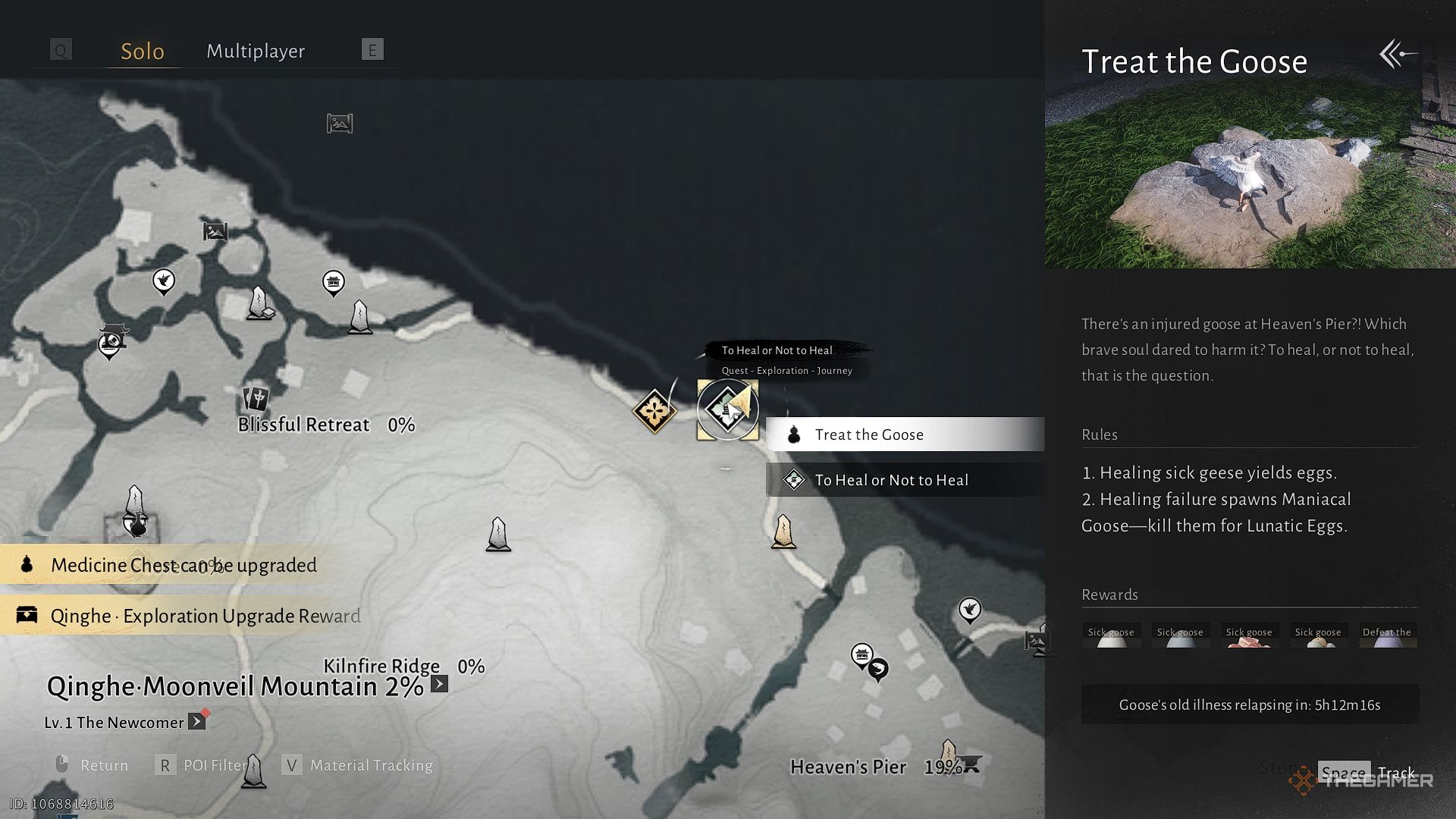 If you head to the Moonveil Mountains in Qinghe – north of Heaven’s Pier and east of the Blissful Retreat – you’ll see a group of young geese by the river. Near the bridge, you’ll find a goose that’s clearly unwell, resting on the rocks. You’ll be able to help heal it when you get closer.