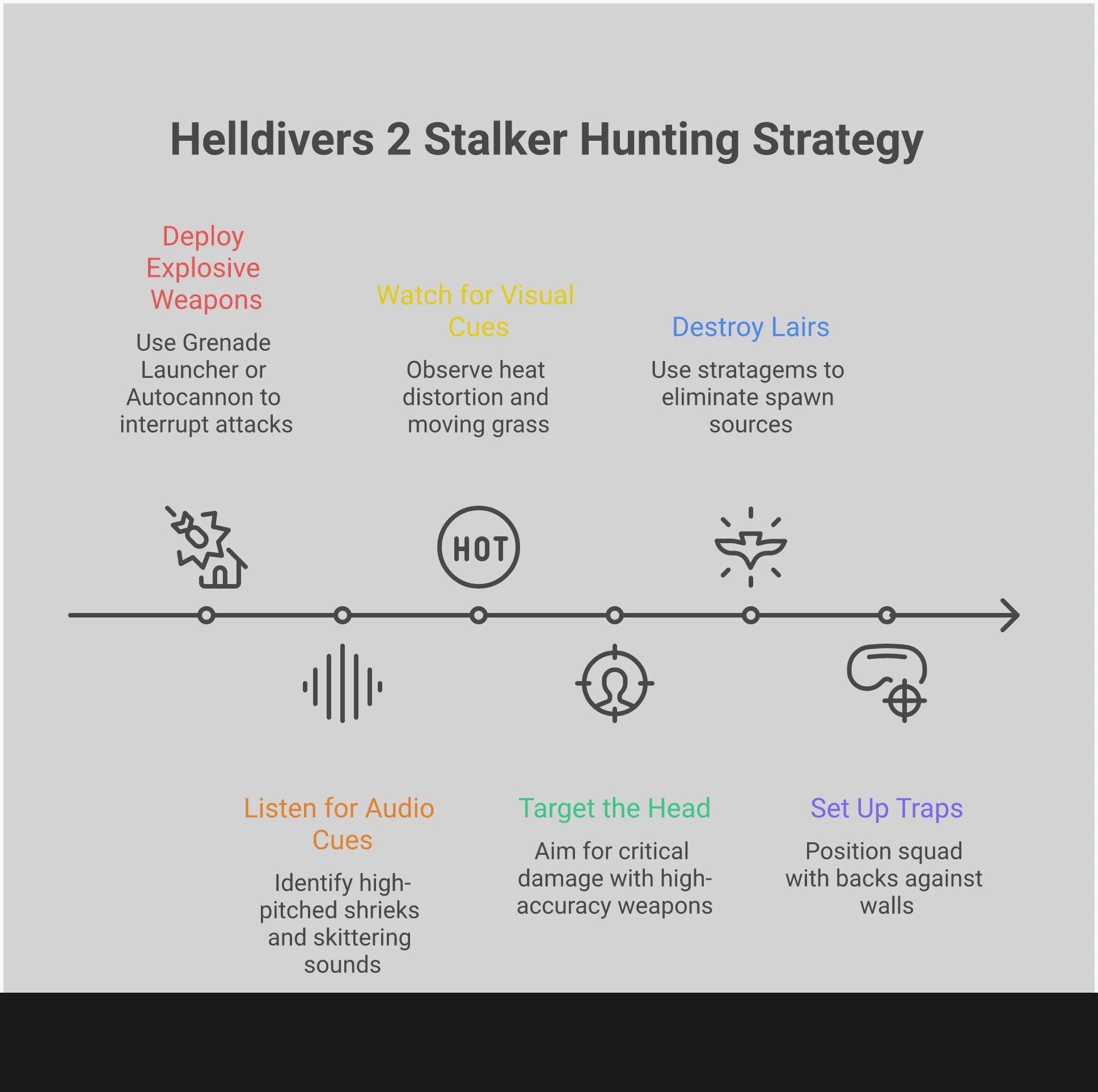 Stalkers are dangerous alone, and Helldivers become easy targets when isolated. Always try to fight them as a team. The best way to take down a Stalker is to focus all your fire on it at once. If someone spots one, they should immediately alert the team, and everyone should target that single enemy. Four Helldivers working together can quickly eliminate a Stalker before it escapes to heal or starts picking off teammates. This teamwork is what makes our strategy so effective.