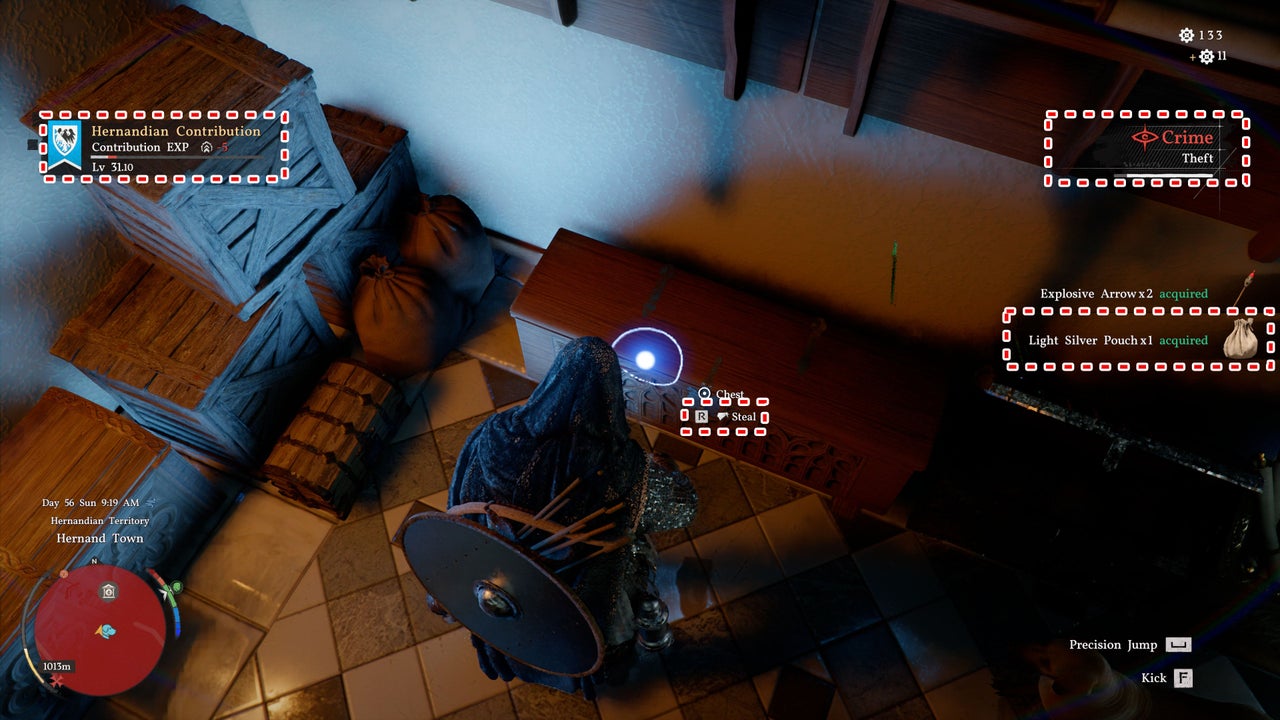Here’s a helpful tip: Taking items that don’t belong to you slightly lowers your Hernandian Contribution, reducing it by 5 experience points per item. You can easily earn this back by completing side quests or bounties. This allows you to get new gear early in the game!