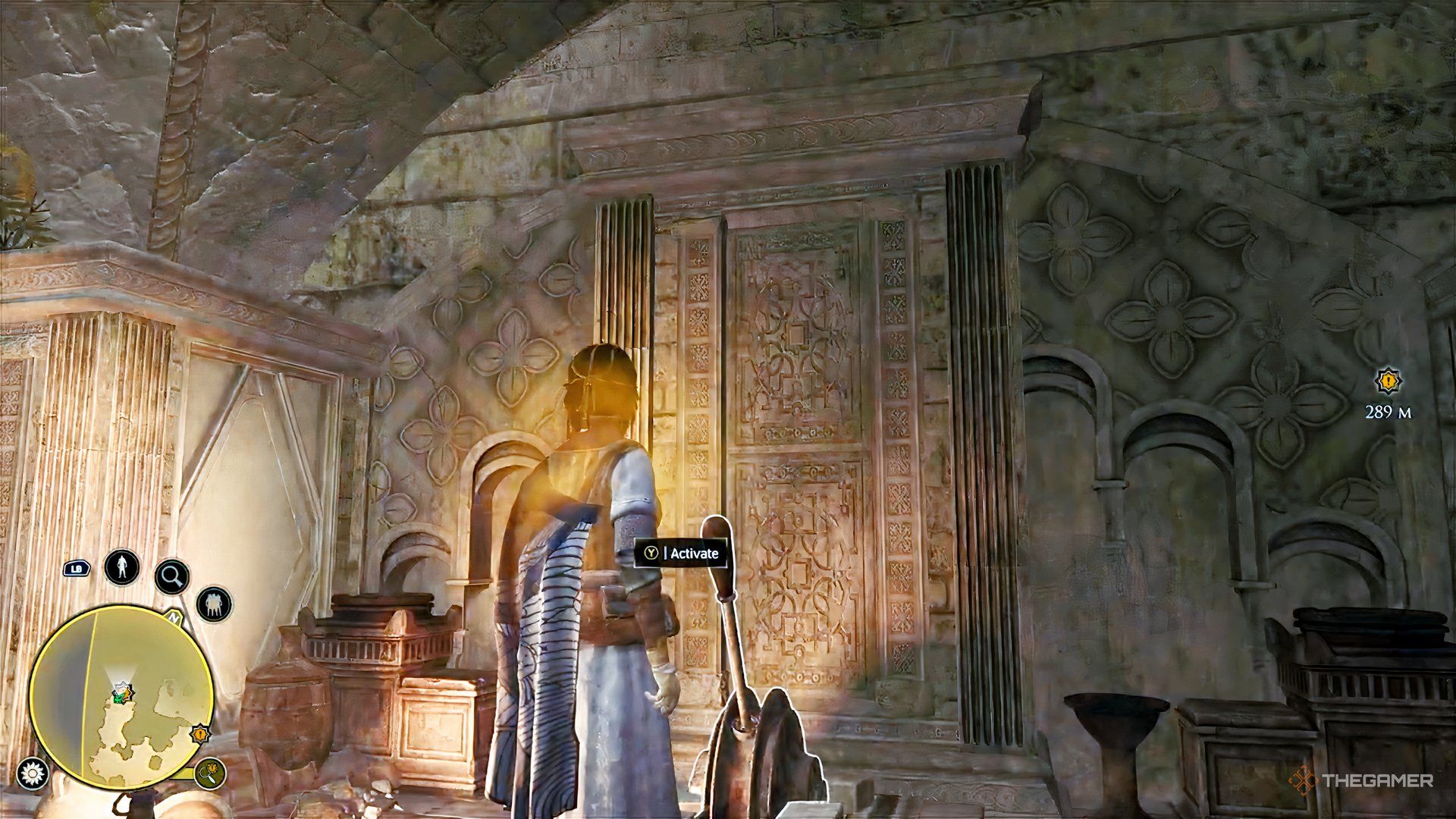 You’ll find the first lever after descending the initial stone steps, then taking a left down another set of steps into a small group of rooms. Look for the lever connected to a statue in one of those rooms. Continue deeper into the ruins, moving past the majida.