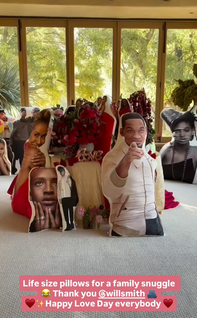 Jada shared a video on Instagram of a collection of large pillows, writing, “Life size pillows for a family snuggle!” She thanked Will Smith and wished everyone a Happy Valentine’s Day.