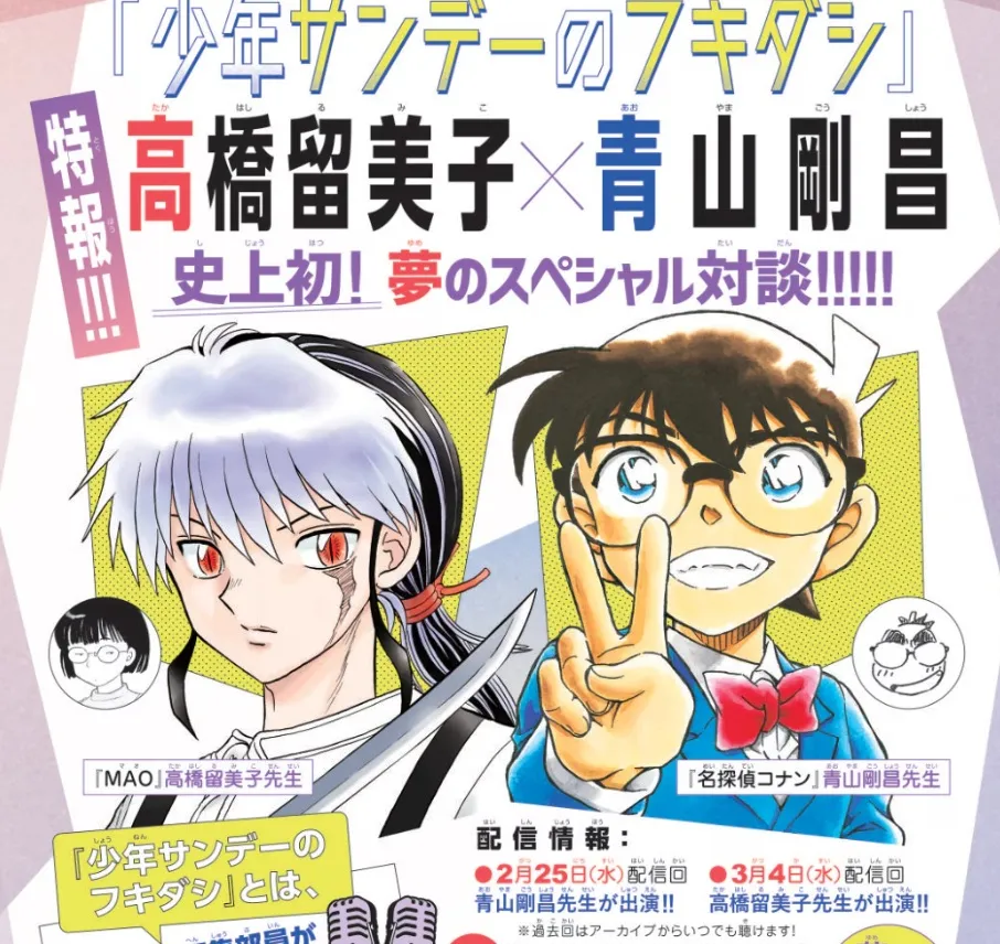Shueisha, a major publisher, has a podcast dedicated to the world of manga. The podcast often features interviews with famous manga artists, discussing both their past work and the current state of the industry. Recently, the podcast “Shonen Sunday’s Speech Bubble” hosted Gosho Aoyama, the creator of Case Closed (known as Detective Conan in Japan), who talked about his series and offered advice to aspiring artists. Next week, on March 4th, the podcast will feature Rumiko Takahashi. Then, on March 11th, Aoyama and Takahashi will appear together in a special crossover episode. To celebrate, new artwork has been released showing characters from Rumiko Takahashi’s latest series, Mao, alongside Detective Conan.