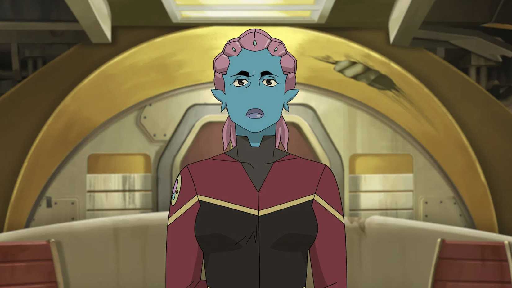 When the crew of Invincible first comes aboard The Venture, the captain introduces three members: Worg, Download, and Counselor Tuva. These characters are obvious spoofs of Worf, Data, and Deanna Troi from The Next Generation, and their visual appearances closely resemble the Star Trek characters they’re parodying, which adds to the humor.