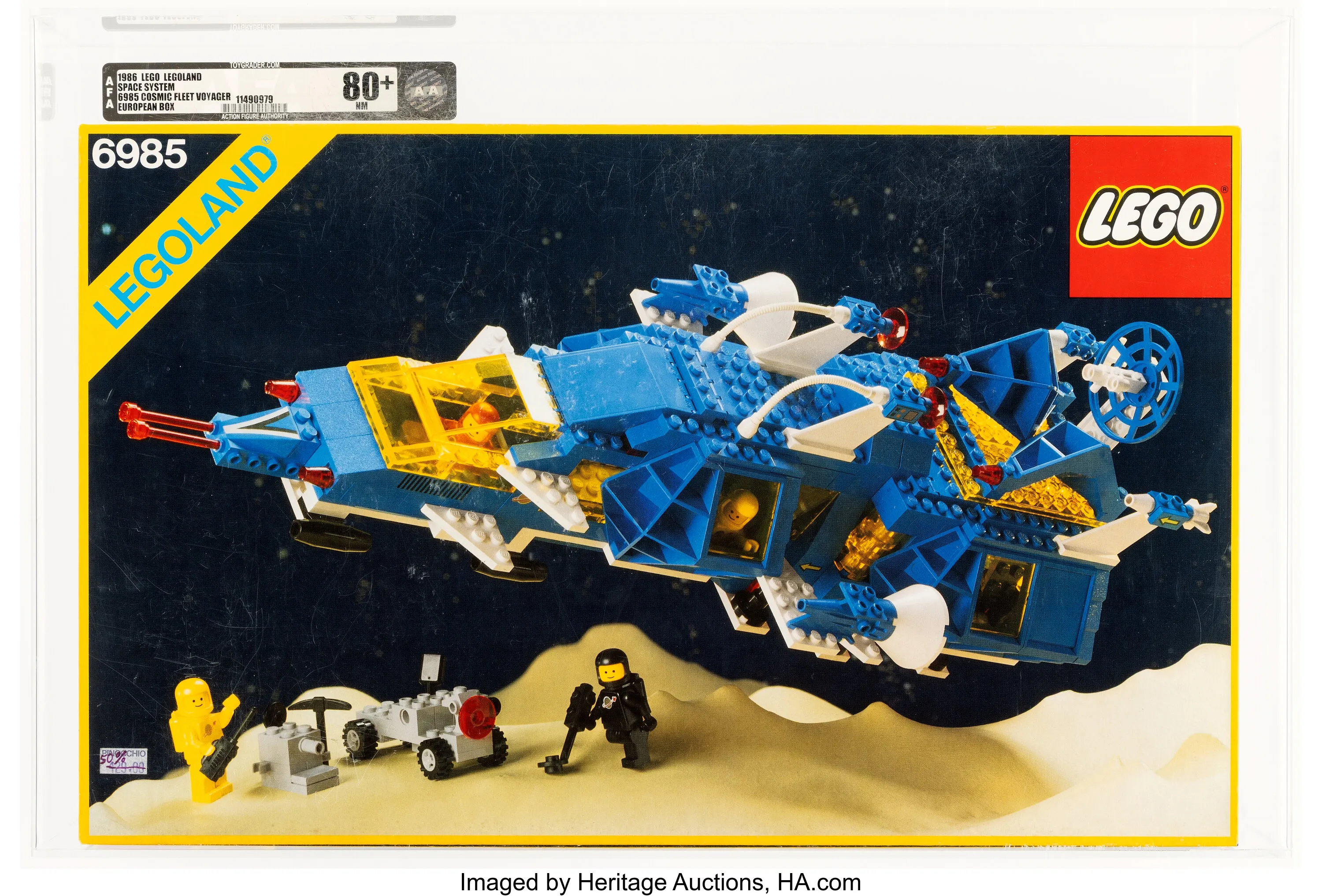 We’re starting with two LEGO sets from the world of space! First is the LEGO Classic Space Cosmic Fleet Voyager, originally released in 1986. This particular set has been professionally graded as AFA 80+ Near Mint – it’s currently the only one of its kind to be graded. It’s packed with details, includes four minifigures and a rover, and has a large number of pieces. Bidding is currently at $1,100, and you have two days left to place your bid and potentially own this rare set.