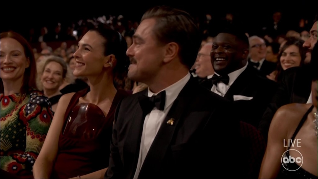 Leonardo DiCaprio and Vittoria Ceretti weren’t photographed together on the red carpet, but they were spotted sitting next to each other while Conan O’Brien performed. DiCaprio, 51, wore a traditional black tuxedo, while Ceretti, 27, wore a red dress with a see-through acrylic top.