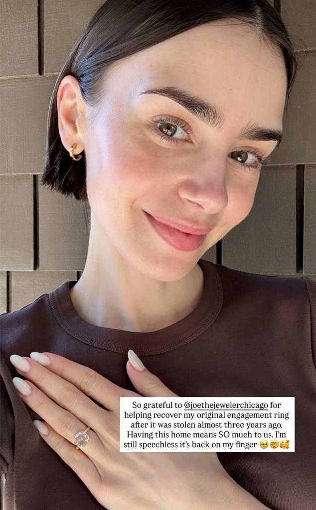 The Emily in Paris star shared on Instagram that she’s incredibly thankful to @joethejewelerchicago for recovering her engagement ring, which was stolen nearly three years ago. She wrote that having it back home is deeply meaningful and she’s still amazed it’s on her finger again.