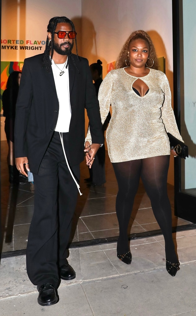 Lizzo wore a long-sleeved gold dress with cutouts, while Myke chose a completely black outfit over a white Nike t-shirt.
