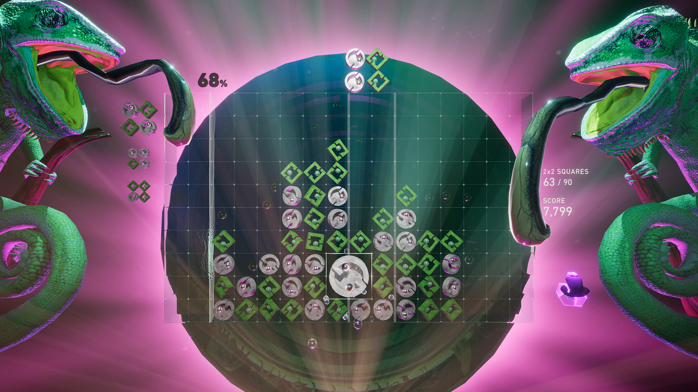 Instead of reinventing the classic Lumines formula, Lumines Arise builds upon it, taking advantage of modern hardware and the lessons learned from Tetris Effect. Each stage is more detailed and visually impressive than in previous Lumines games. You’ll encounter unique elements like battling elemental snakes, a vibrant city with a playful cat, levels filled with shifting fruits and vegetables, and even hatching eggs that bring adorable birds to life within the game.